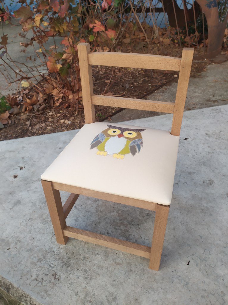 Chaise enfant dont la structure bois a été fabriquée par mon ébéniste Patrice Gimeno.