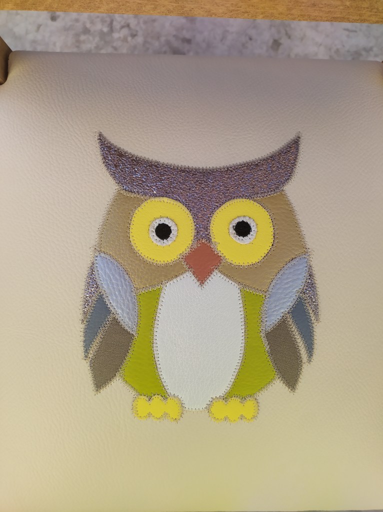 Assise en mousse habillée en similicuir avec un patchwork représentant une chouette dans les couleurs gris, jaune et vert sur un fond de similicuir beige . Bois teinté en chêne clair.