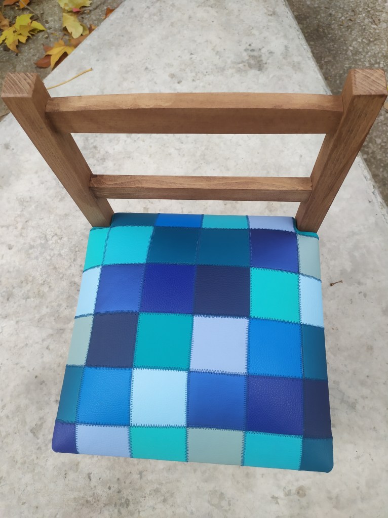 Assise en mousse habillée en similicuir avec un patchwork en damier dans un camaïeu de bleu. Bois teinté en chêne clair.