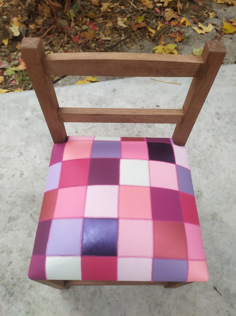 Assise en mousse habillée en similicuir avec un patchwork en damier dans un camaïeu de rose et violet. Bois teinté en chêne clair.