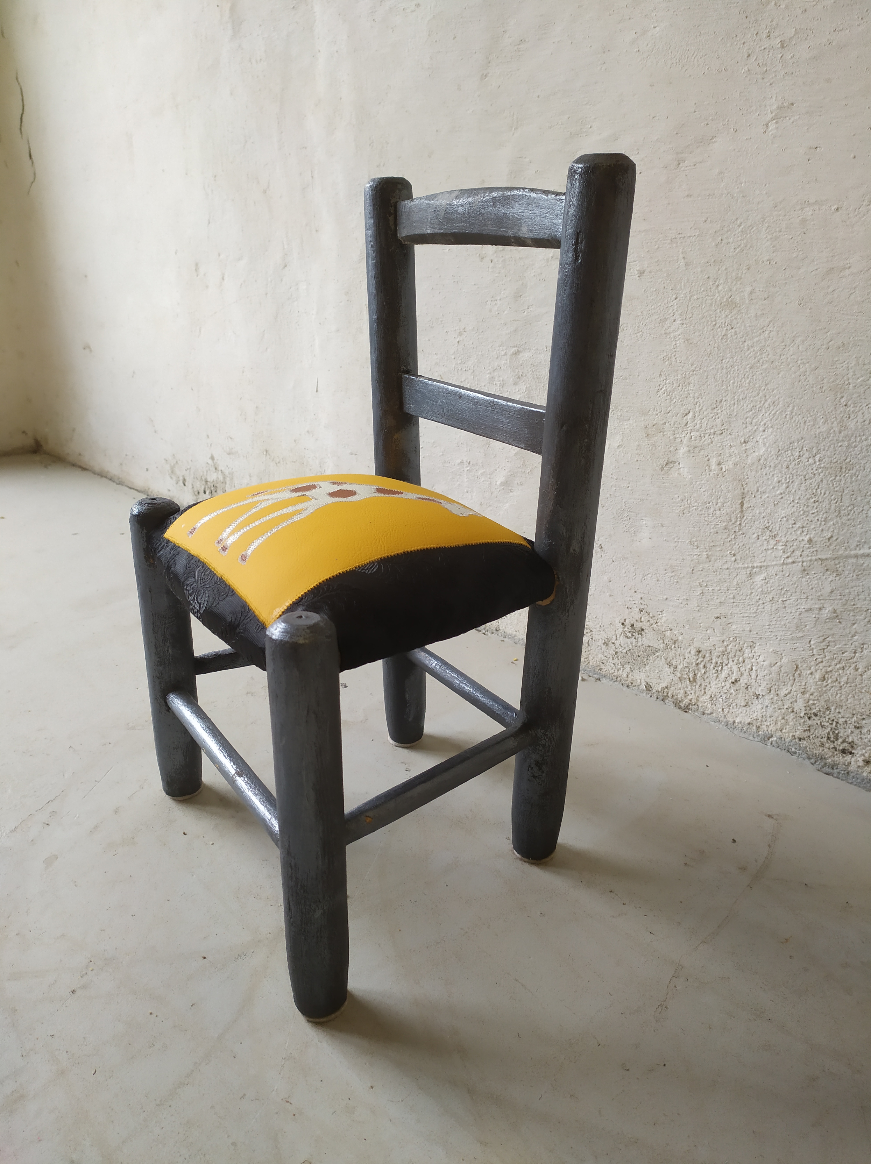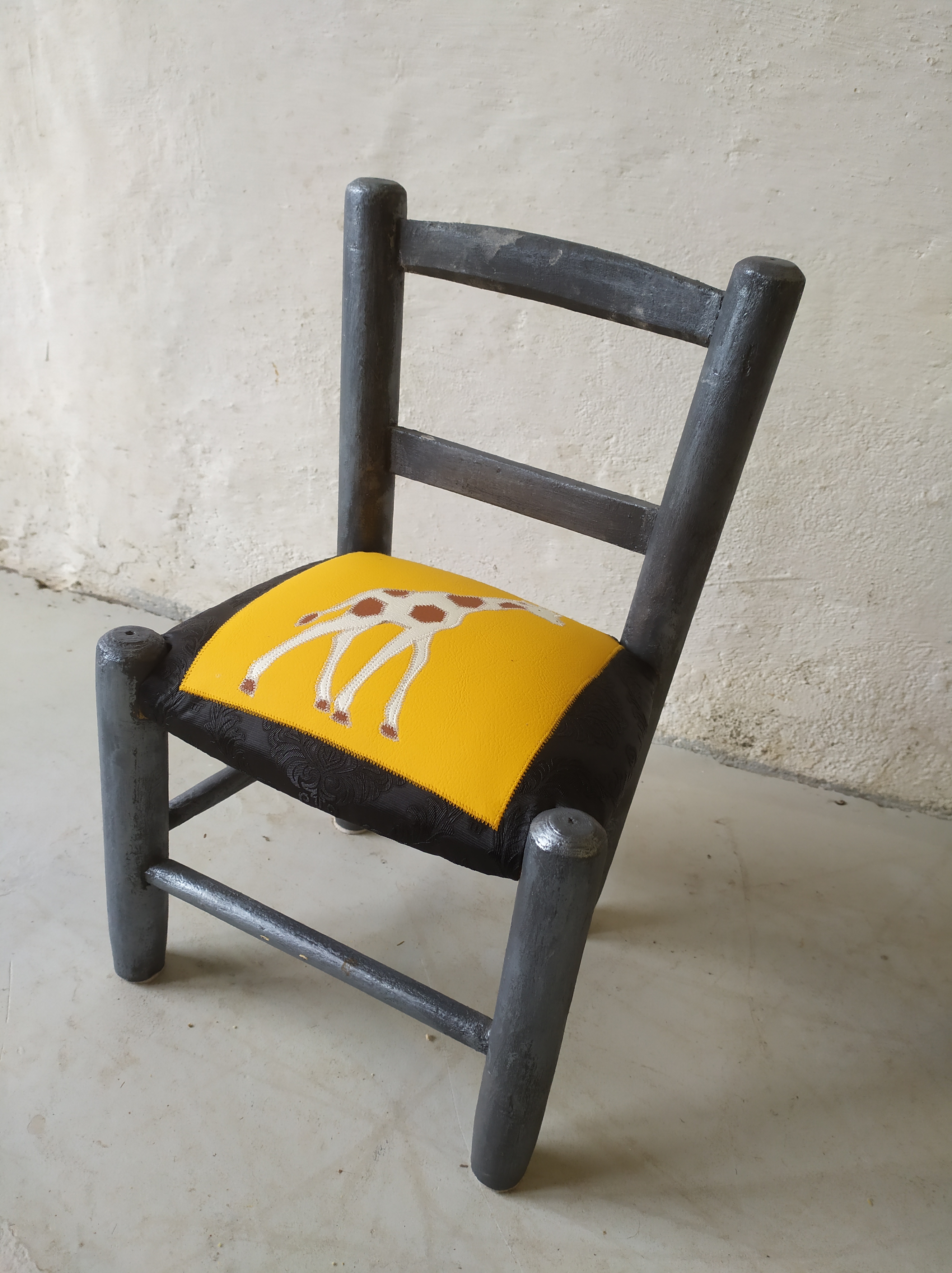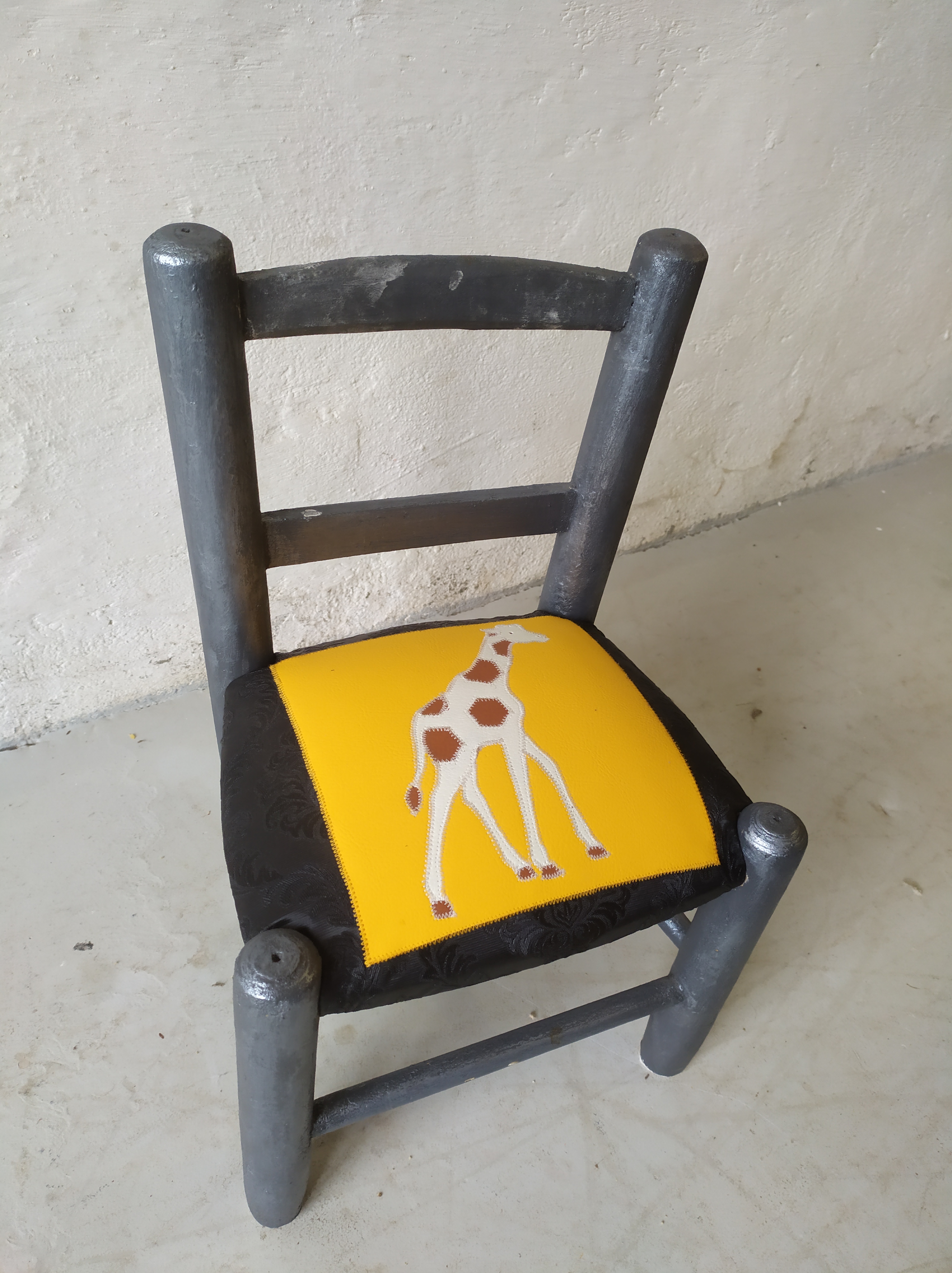 Chaise enfant avec une assise initialement en paillage. Création d’une garniture moderne en mousse et habillée en similicuir avec un patchwork représentant une girafe dans les couleurs blanc et bronze sur un fond de similicuir jaune d’or et noir avec des impressions baroques. Bois peint en gris métallisé.