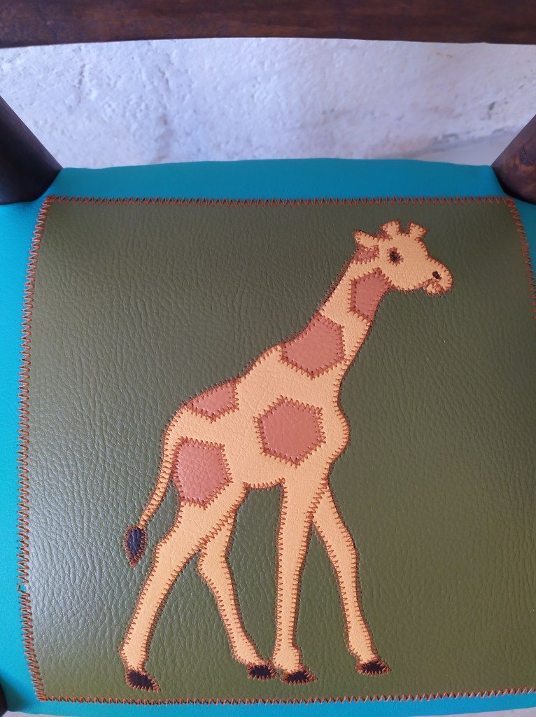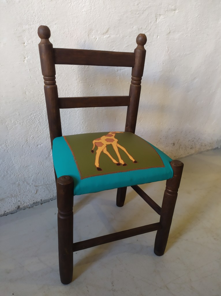 Chaise enfant avec une assise initialement en paillage. Création d’une garniture moderne en mousse et habillée en similicuir avec un patchwork représentant un girafe dans les couleur oranges sur un fond de similicuir vert kaki et bleu.
