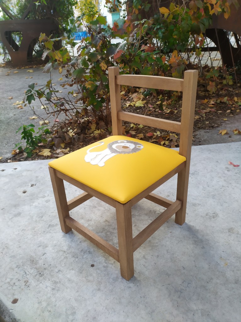 Chaise enfant dont la structure bois a été fabriquée par mon ébéniste Patrice Gimeno.