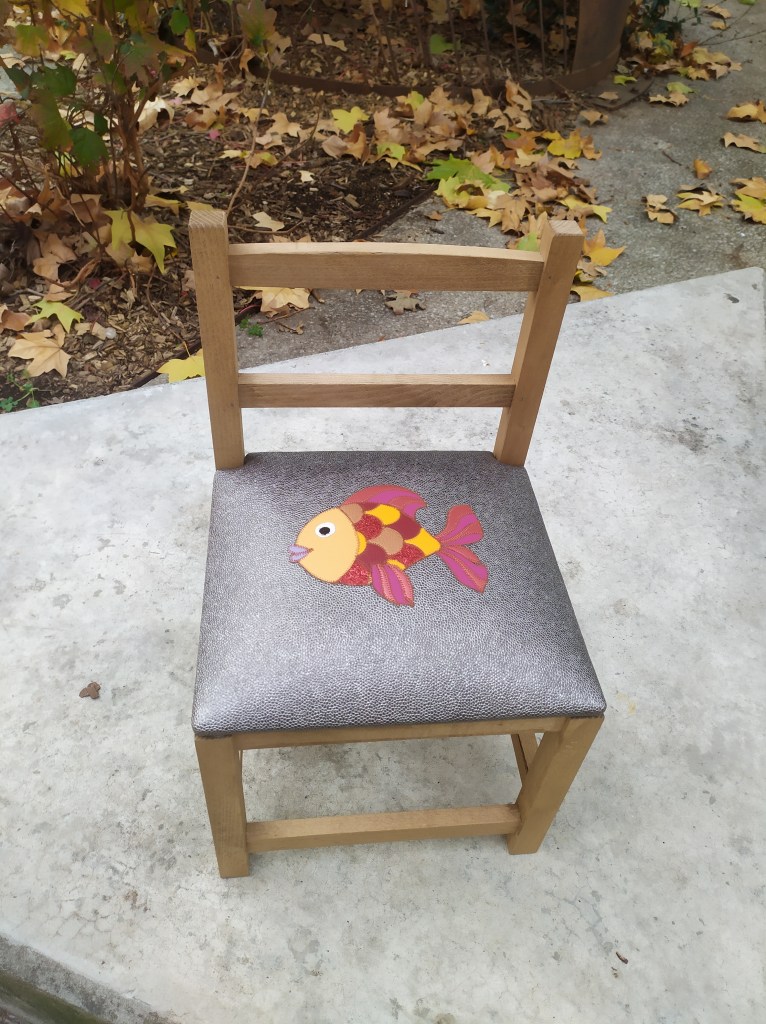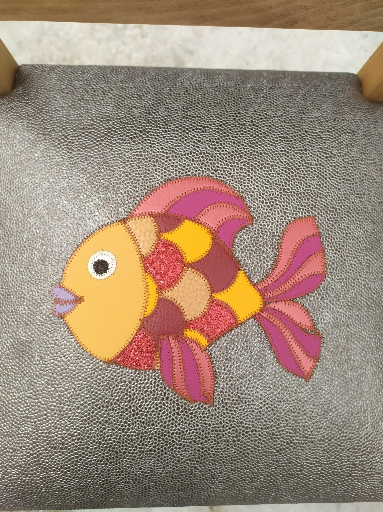 Assise en mousse habillée en similicuir avec un patchwork représentant un poisson dans les couleurs rouge, orangé et violet sur un fond de similicuir gris impression galuchat . Bois teinté en chêne clair.