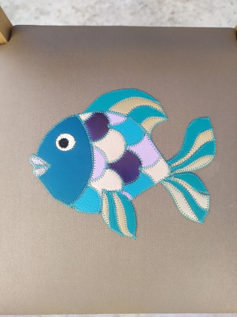 Assise en mousse habillée en similicuir avec un patchwork représentant un poisson dans les couleurs bleu et or sur un fond de similicuir taupe . Bois teinté en chêne clair.