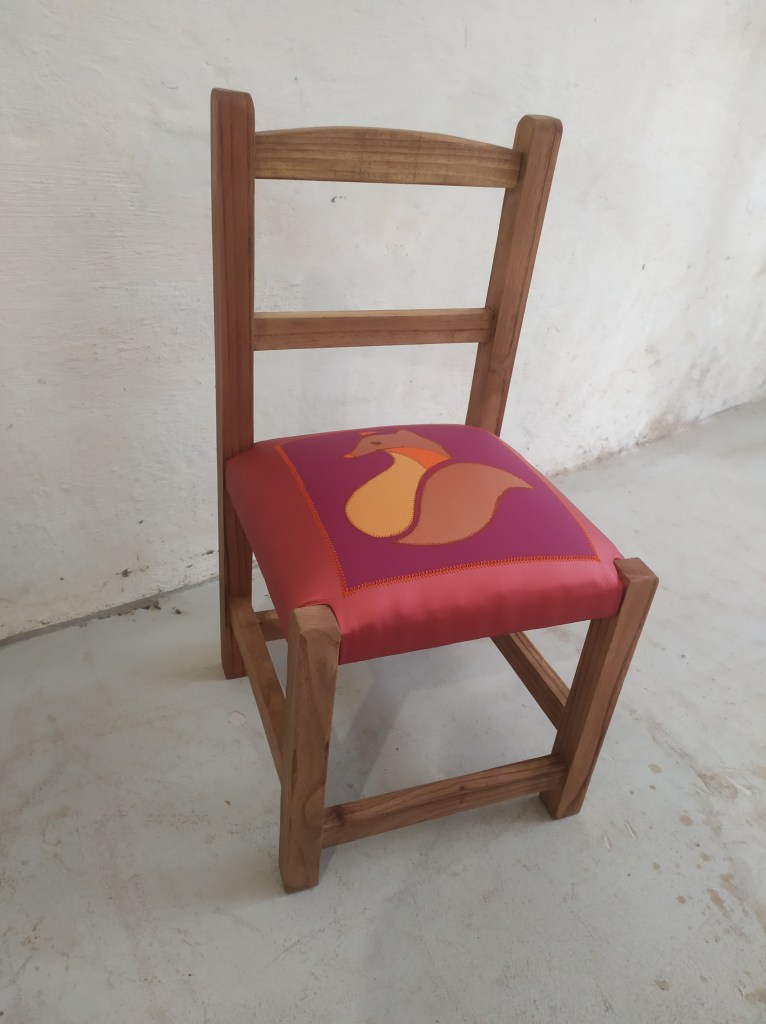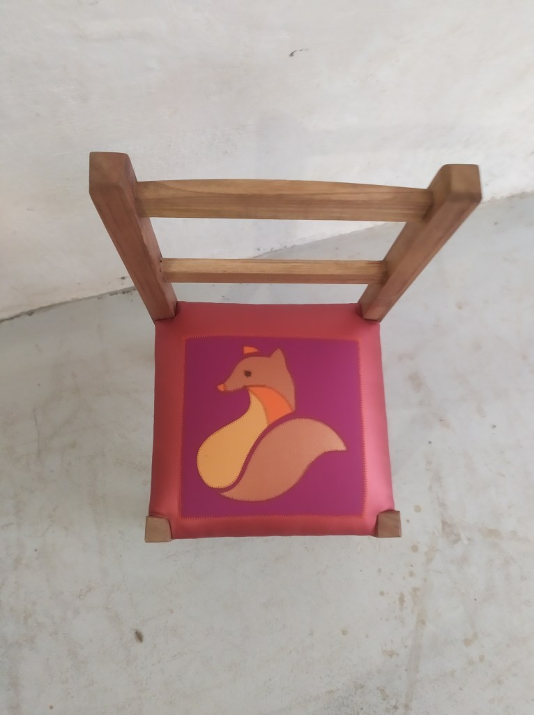 Chaise enfant avec une assise initialement en paillage. Création d’une garniture moderne en mousse et habillée en similicuir avec un patchwork représentant un renard dans les couleur bronze et orange sur un fond de similicuir violet et vieux rose irisé. Bois teinté en chêne clair.