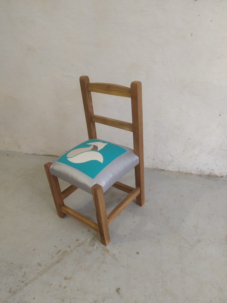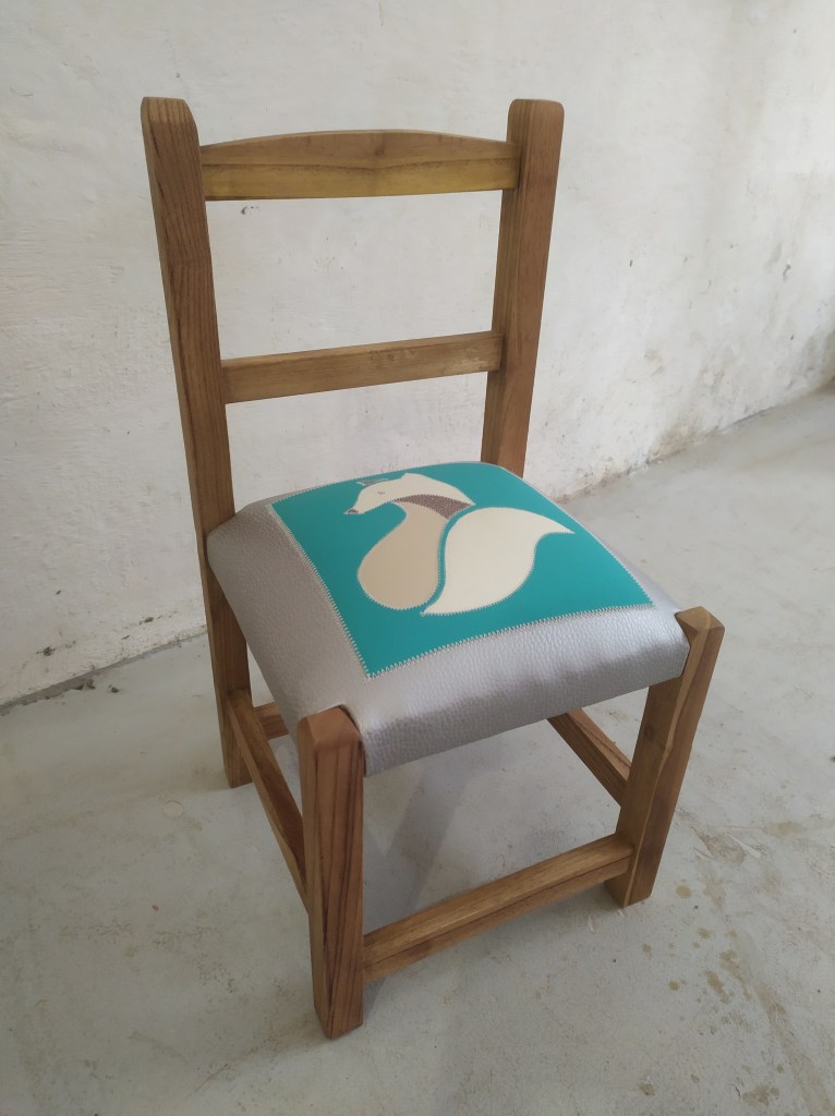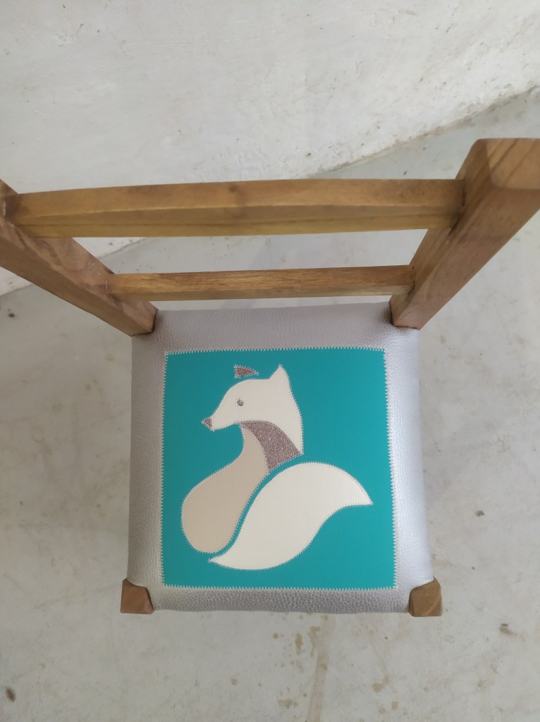 Chaise enfant avec une assise initialement en paillage. Création d’une garniture moderne en mousse et habillée en similicuir avec un patchwork représentant un renard dans les couleur blanc, et gris métallisé sur un fond de similicuir bleu turquoise et argenté. Bois teinté en chêne clair.
