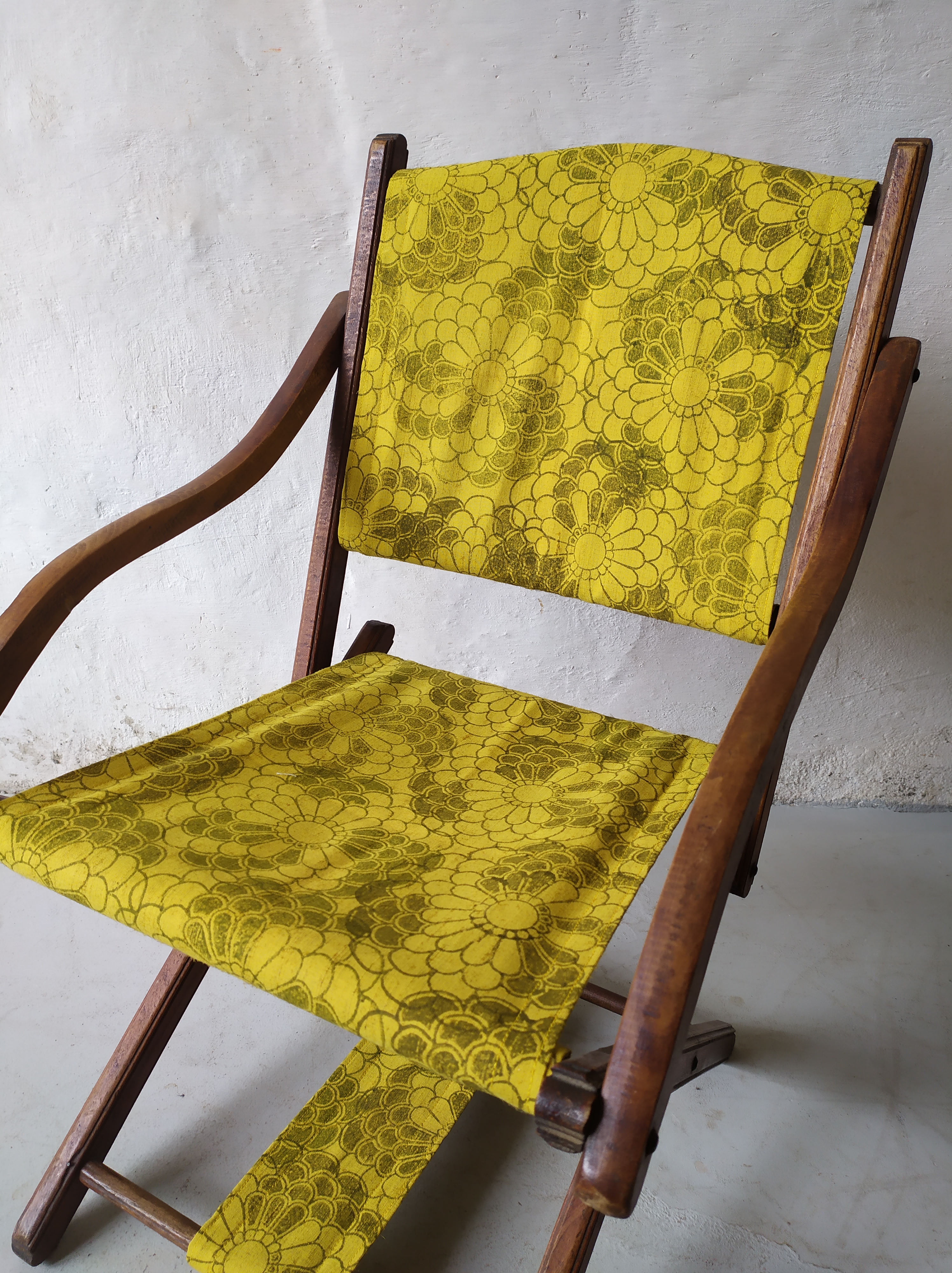 Chaise pliante Meubles tissu "classique" Ancienne chaise pliante restaurée avec un tissu jaune imprimé de motif floraux noir. Tissu renforcé avec un tissu spécial transat pour une solidité maximale. N’hésitez pas à me contacter pour plus de renseignements.
