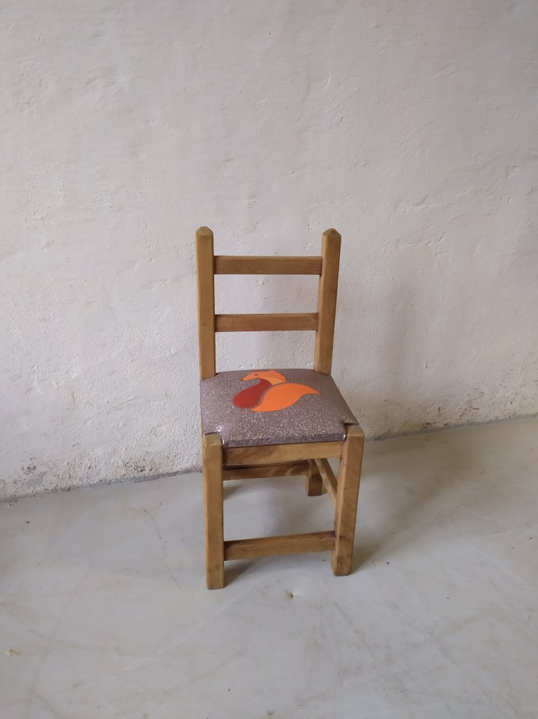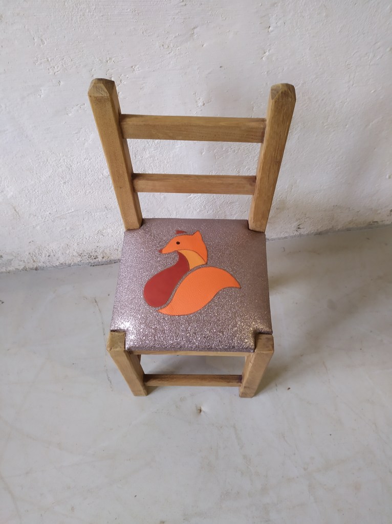 Chaise enfant avec une assise initialement en paillage. Création d’une garniture moderne en mousse et habillée en similicuir avec un patchwork représentant un renard dans les couleur orange sur un fond de similicuir gris à paillettes.