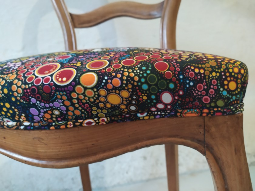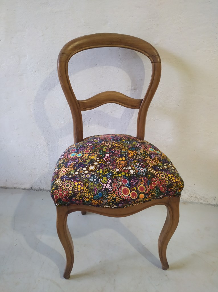 Chaise volante Meubles tissu "classique" Chaise entièrement restaurée avec une garniture traditionnelle. Pose d’un tissu motif bulles multicolores avec une finition double passepoil. N’hésitez pas à me contacter pour plus de renseignements.