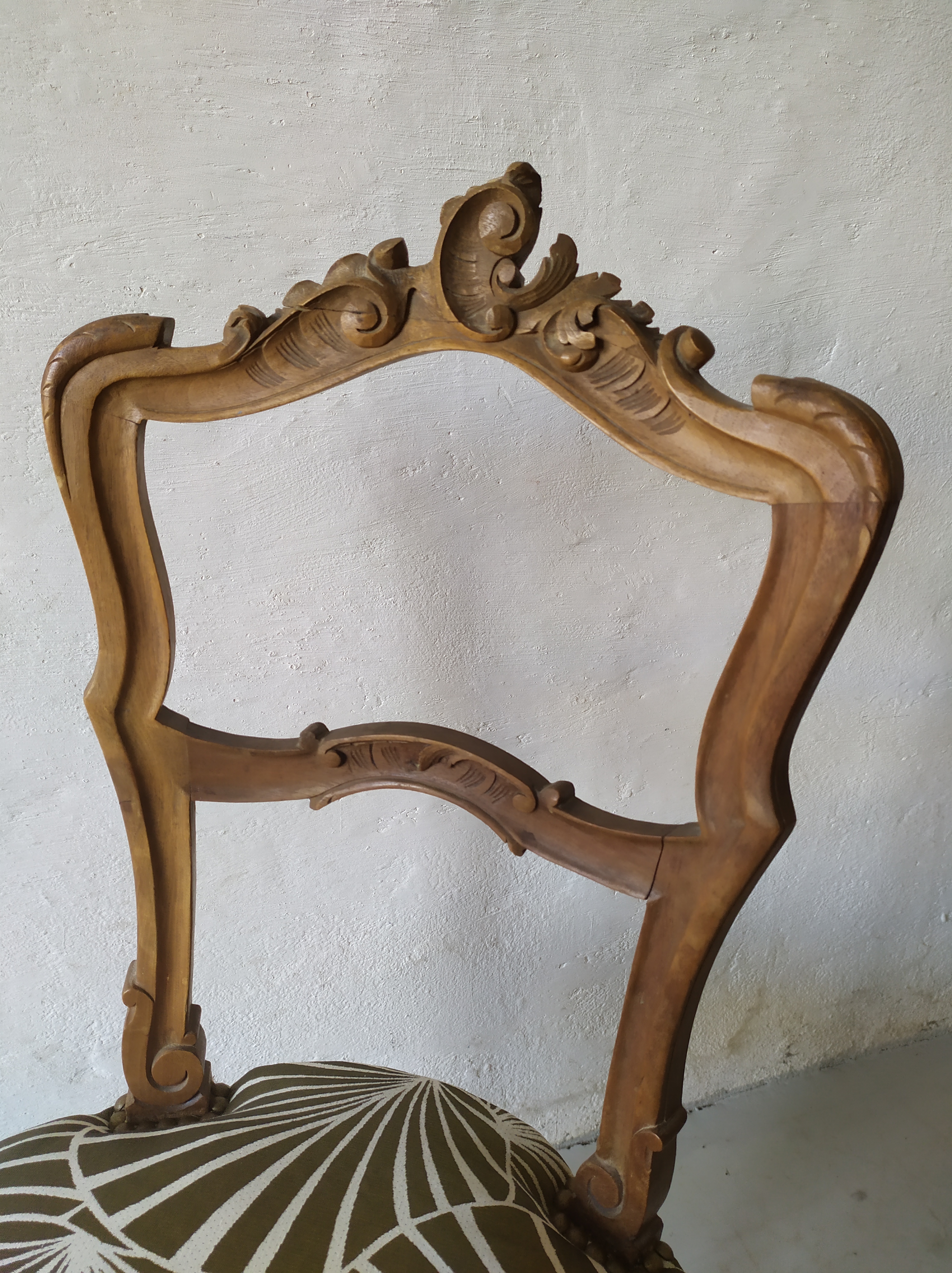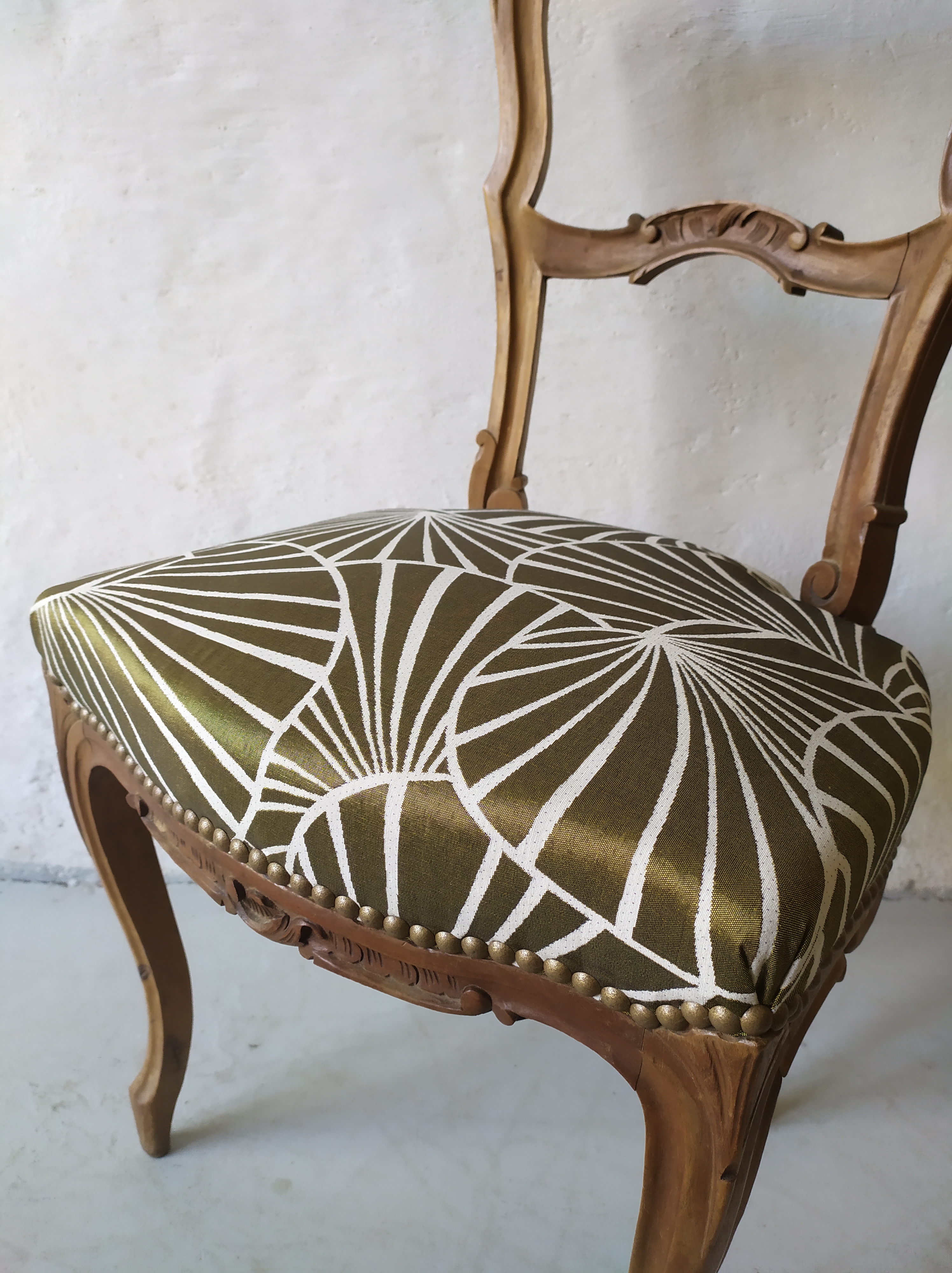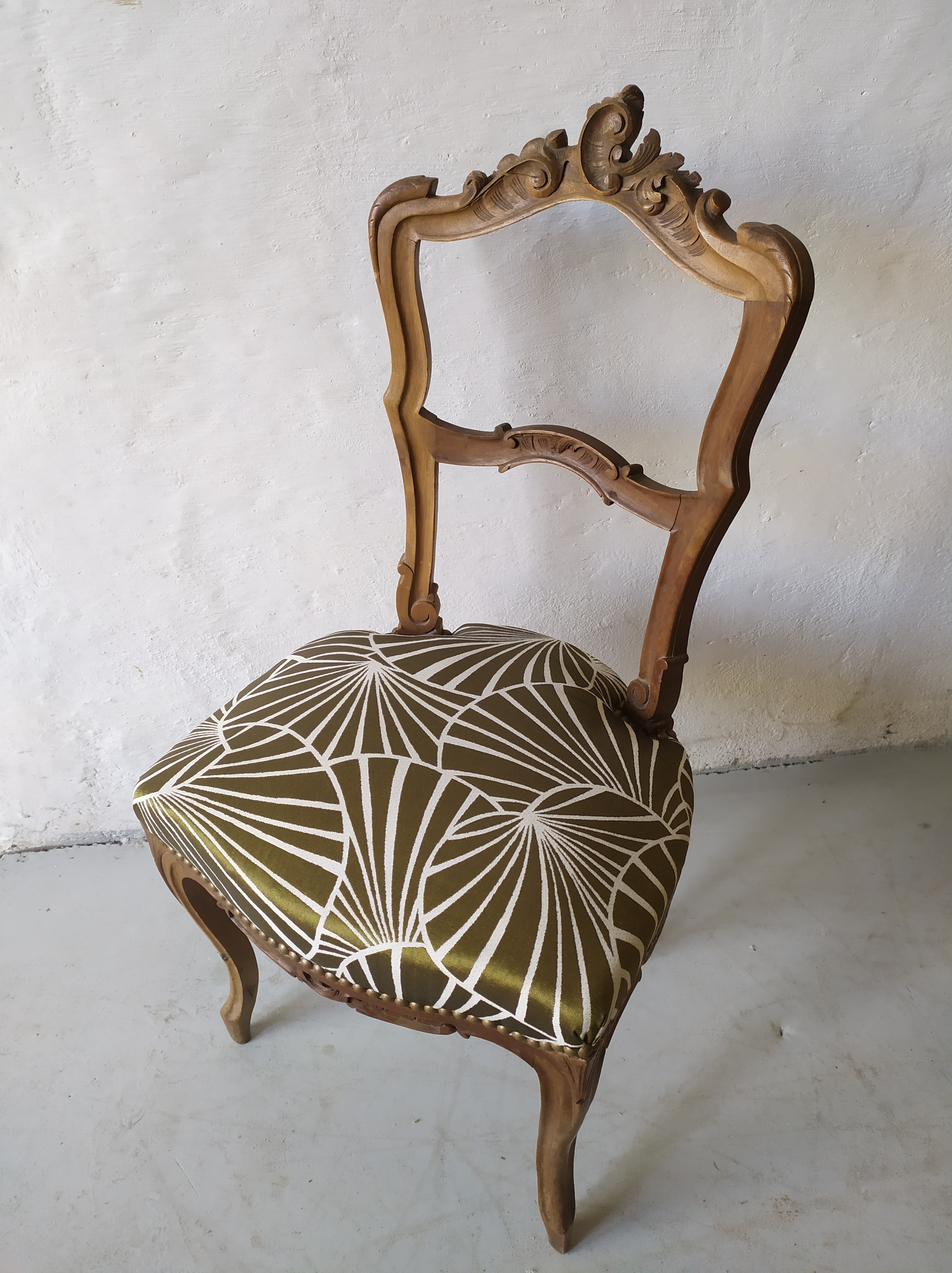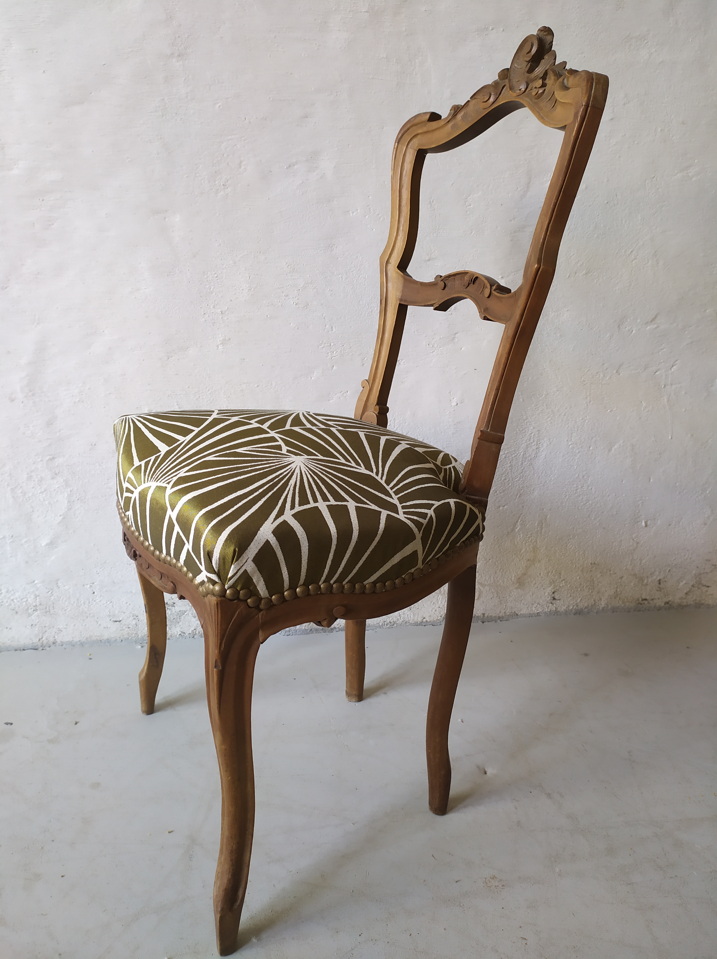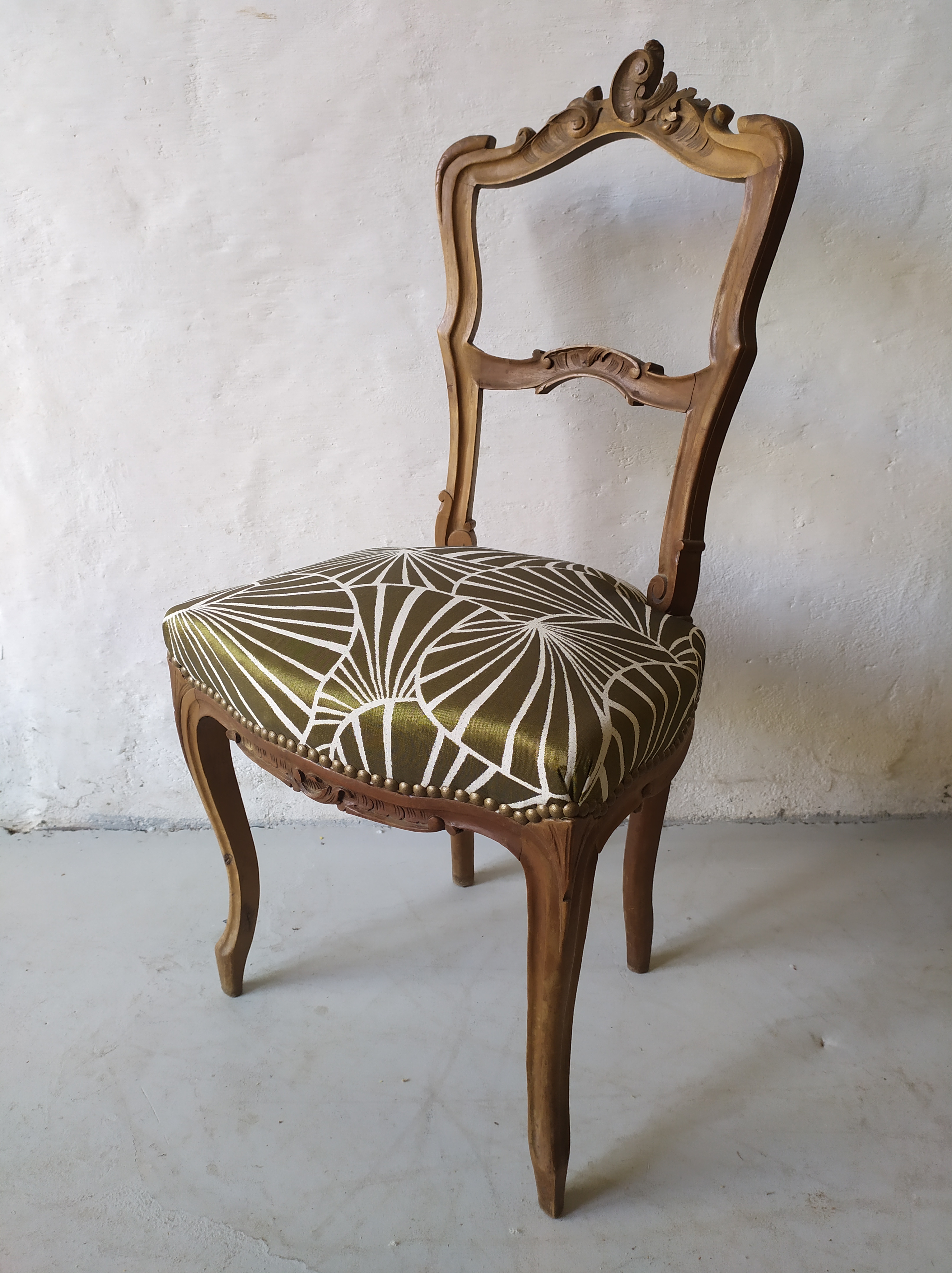 Chaise volante Nénuphar -Chaise Nénuphar-, Meubles tissu "classique" Prix: 100€ Chaise volante restaurée avec un tissu au motif nénuphar cuivré sur un fond couleur lin. Finition clous décoratifs bronze doré. N’hésitez pas à me contacter pour plus de renseignements.