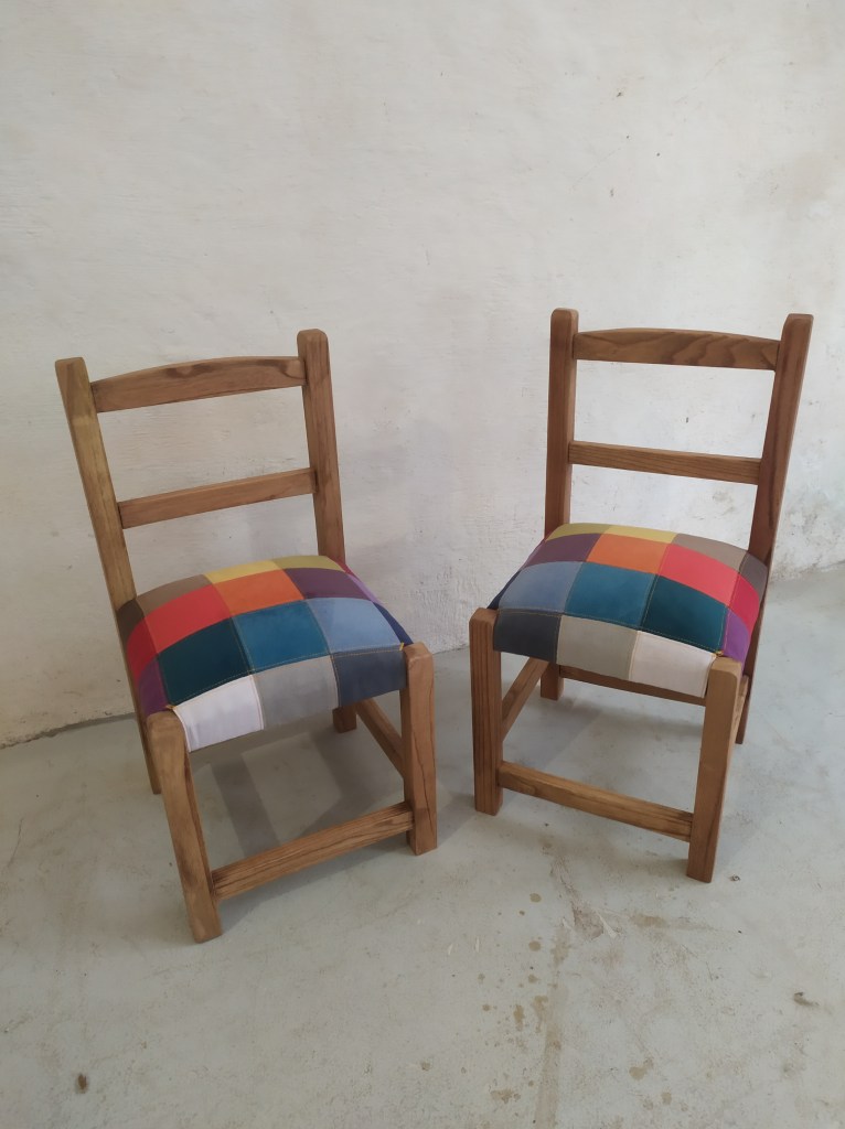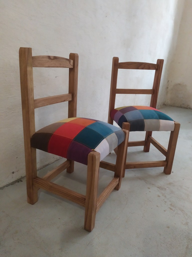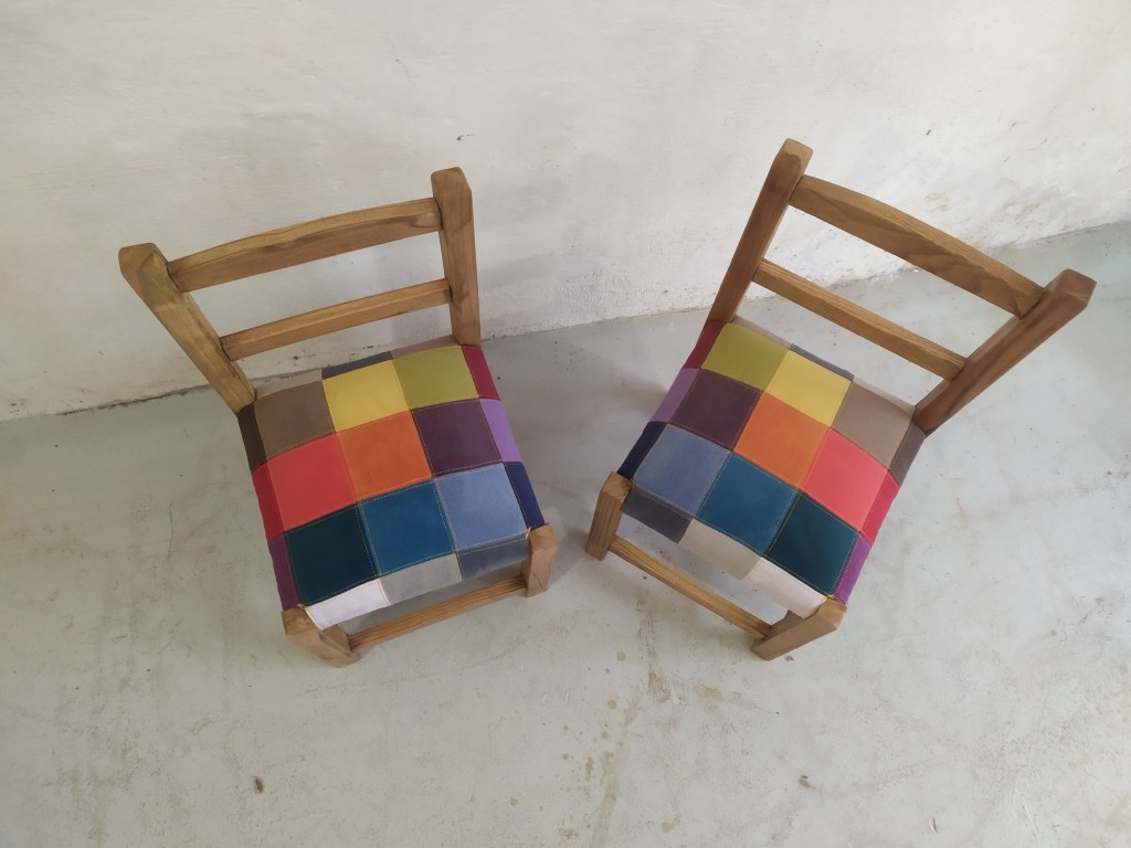 Chaises enfant avec une assise initialement en paillage. Création d’une garniture moderne en mousse et habillées en patchwork de nuancier de couleurs en tissu effet velours anti tâches. Bois teinté en chêne clair.