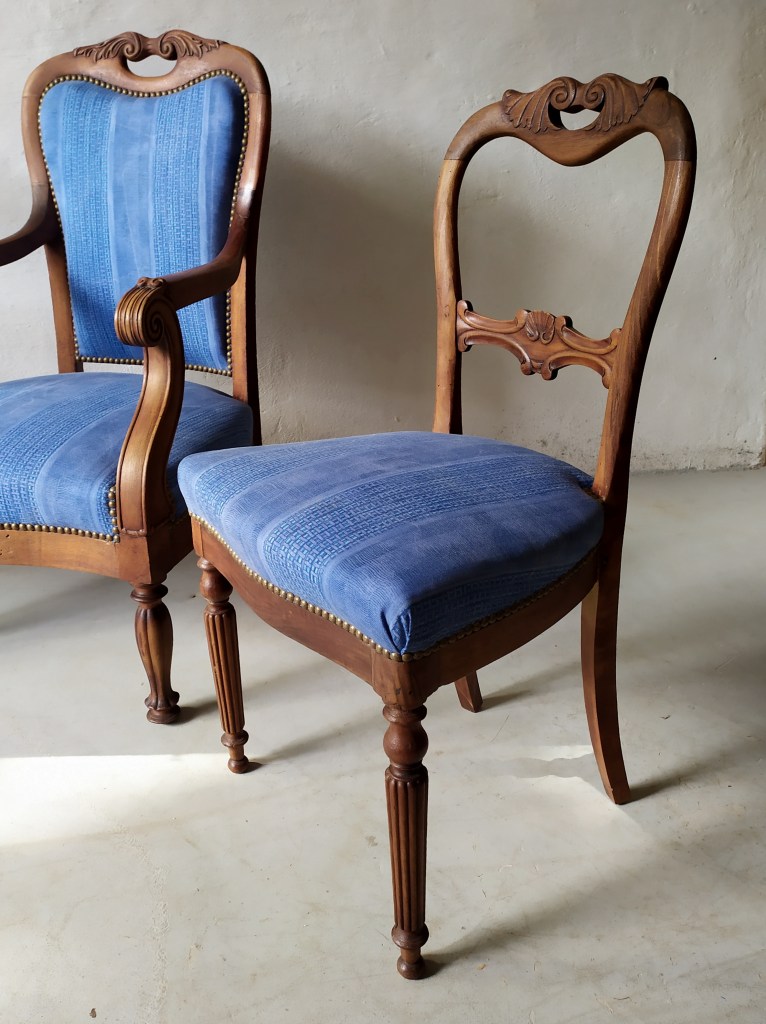 Ensemble deux fauteuils et deux chaises style Louis XVI en garniture traditionnelle crin et ressorts recouvert d’un tissu en coton imprimé rayure ton sur ton bleu