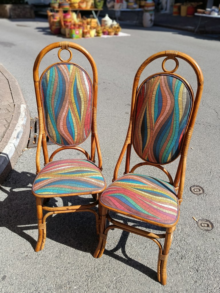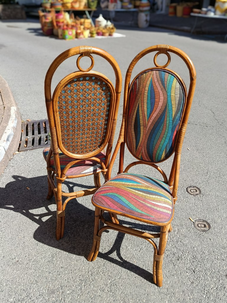Paire de chaises en rotin initialement en cannage que j’ai restaurée en garniture mousse tout en gardant le cannage pour le dossier extérieur.