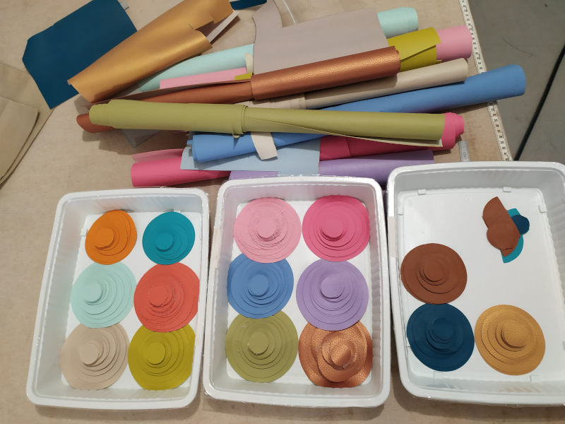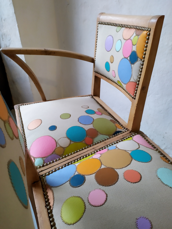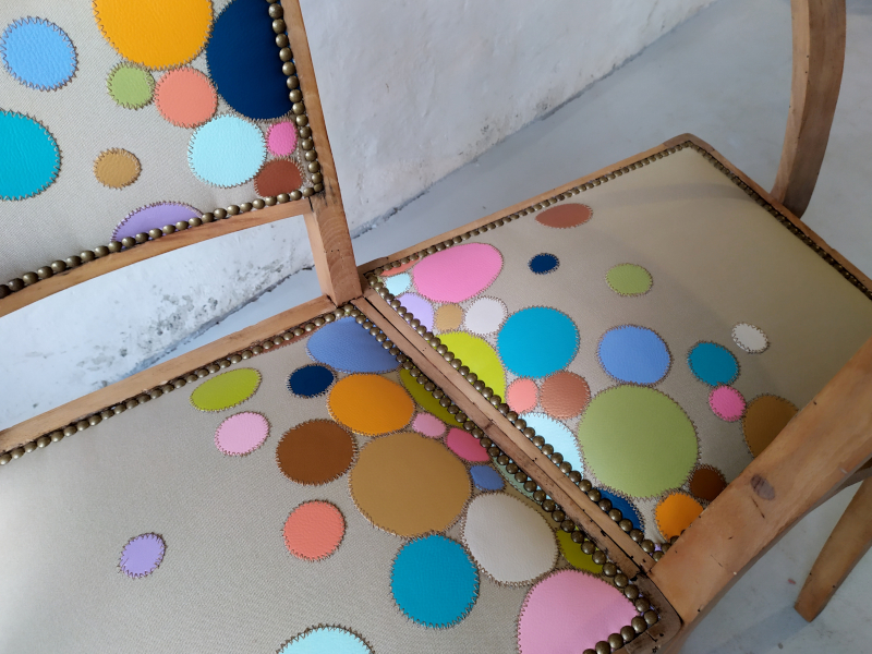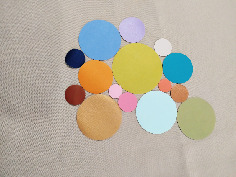 Tissu en patchwork de similicuir en ronds de différents diamètres multicolore appliqué sur un tissu coton beige et assemblage avec des coutures beiges.