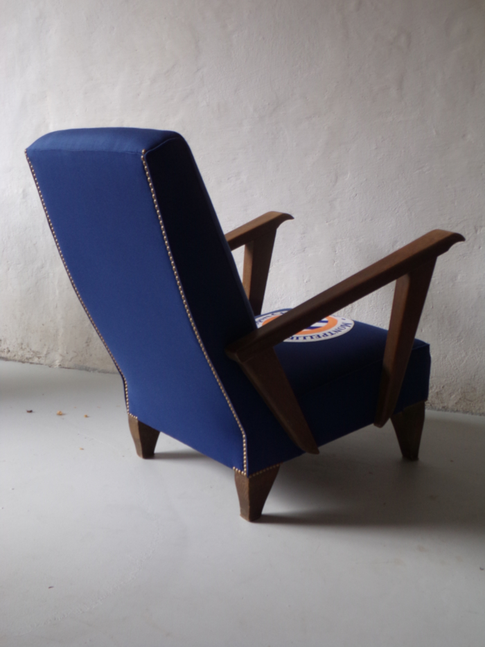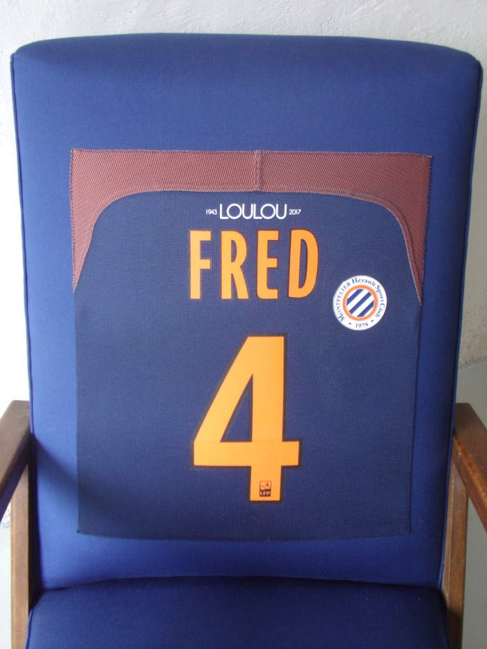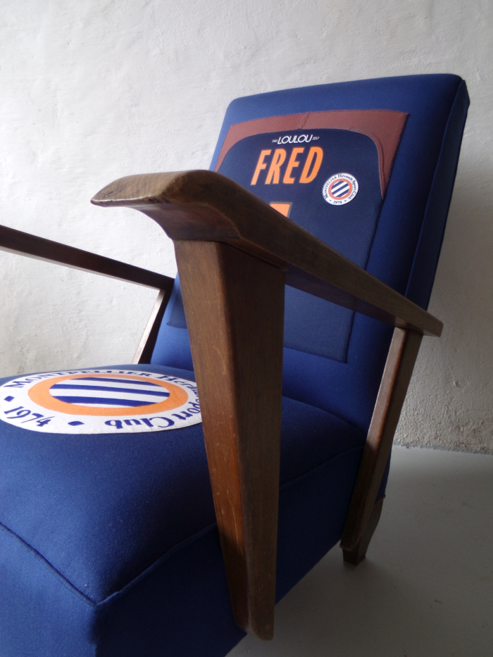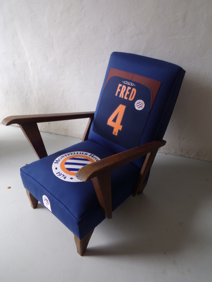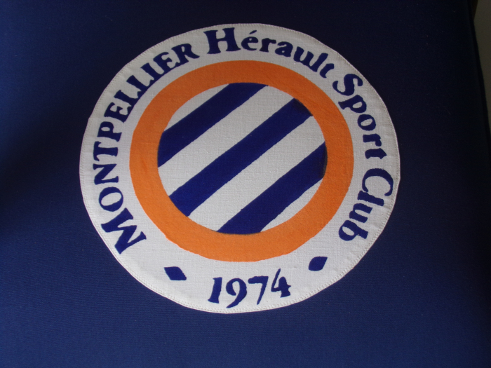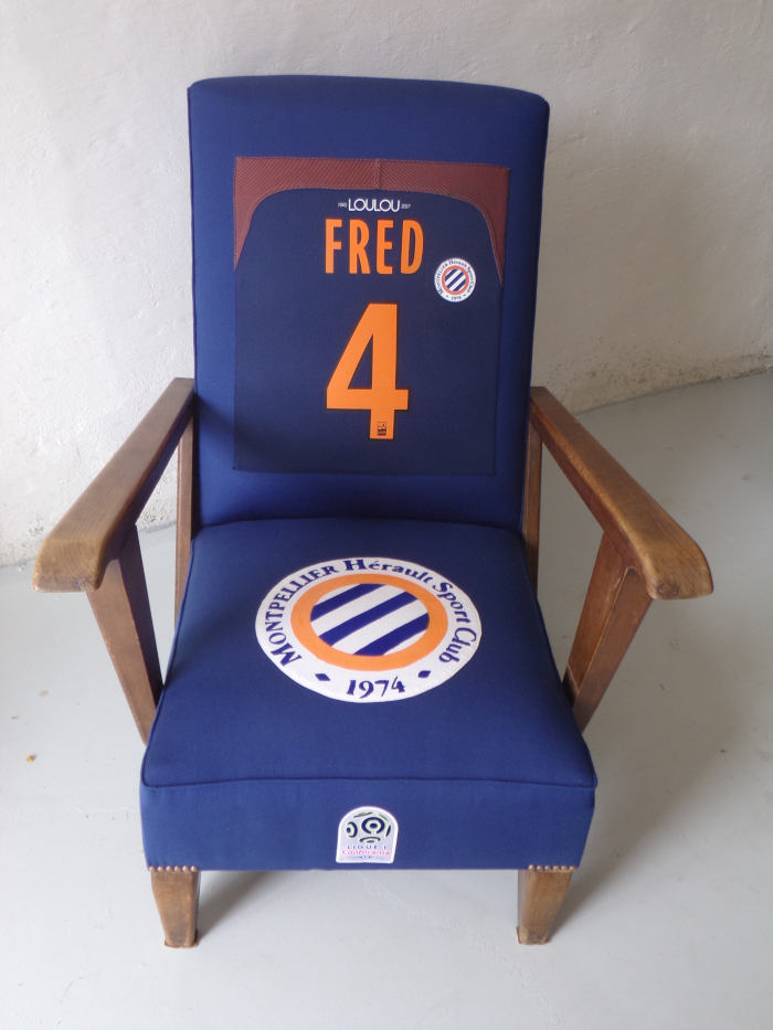 Commande spéciale club de foot de Montpellier. Logo sur l’assise fait avec de la peinture à tissu, réalisé avec un pochoir entièrement fait main.