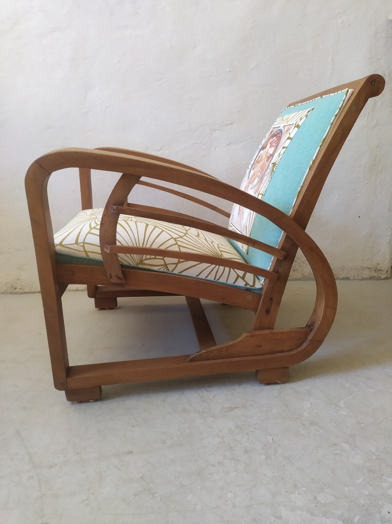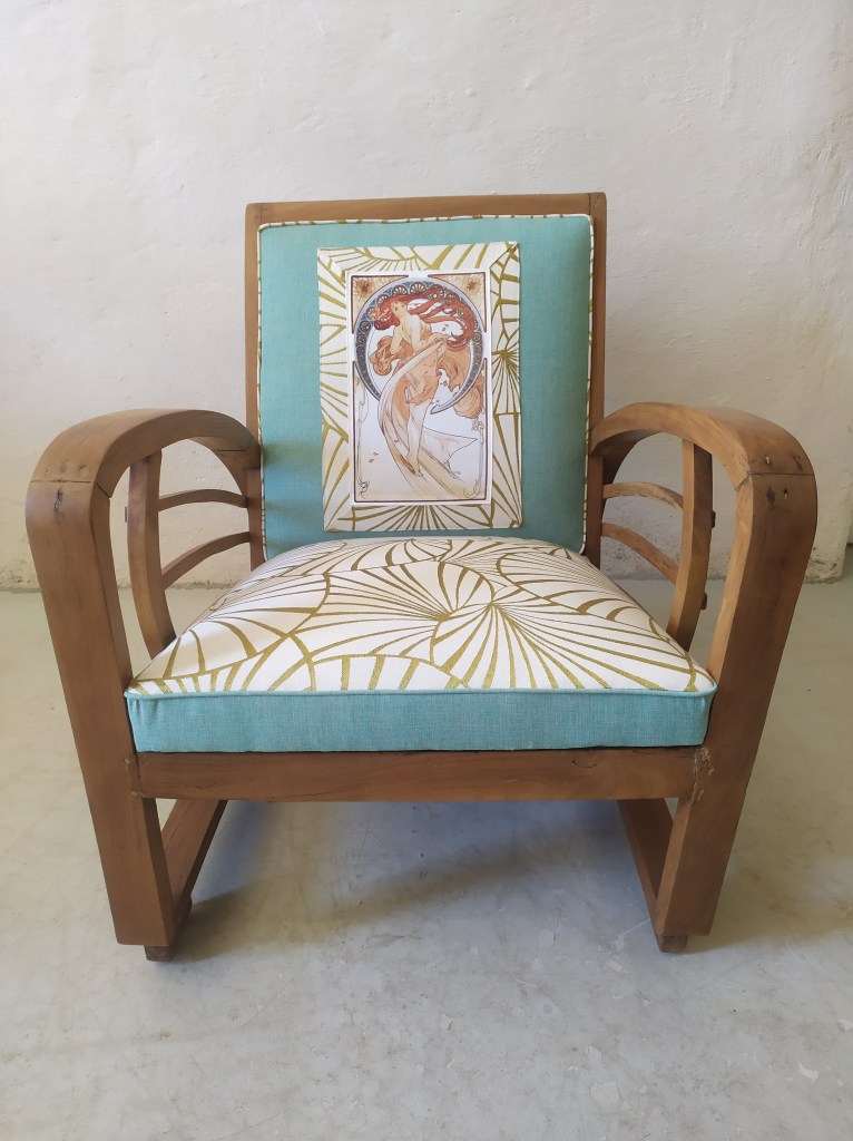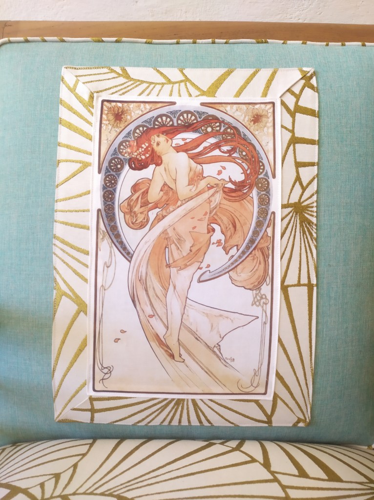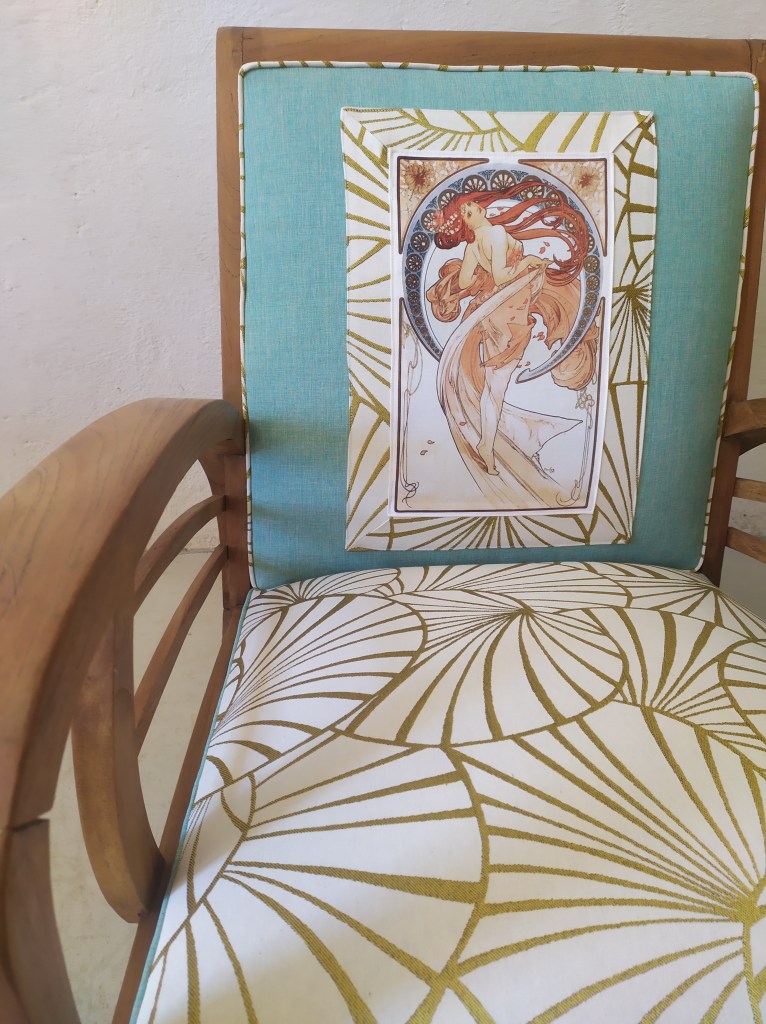 Dossier réalisé avec un assemblage de plusieurs tissus comprenant une impression sur tissu d’un tableau de Mucha encadré du même tissu que l’assise et un tissu vert d’eau.