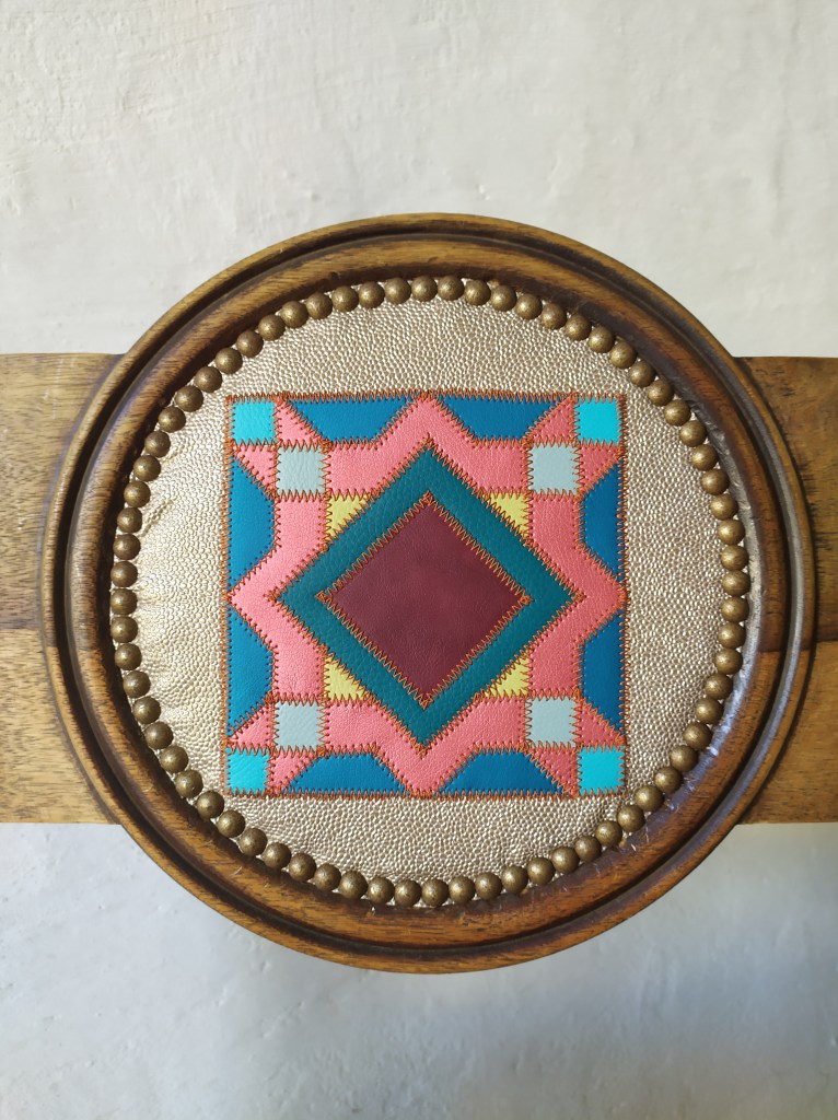 Fauteuil avec une création de tissu en patchwork de similicuir représentant deux motif géométrique. Mélange de rose irisé, bordeaux, vert et différents bleus assemblés avec des coutures couleur brique sur un fond de similicuir effet galuchat couleur métal. Finition clous décoratifs bronze doré.