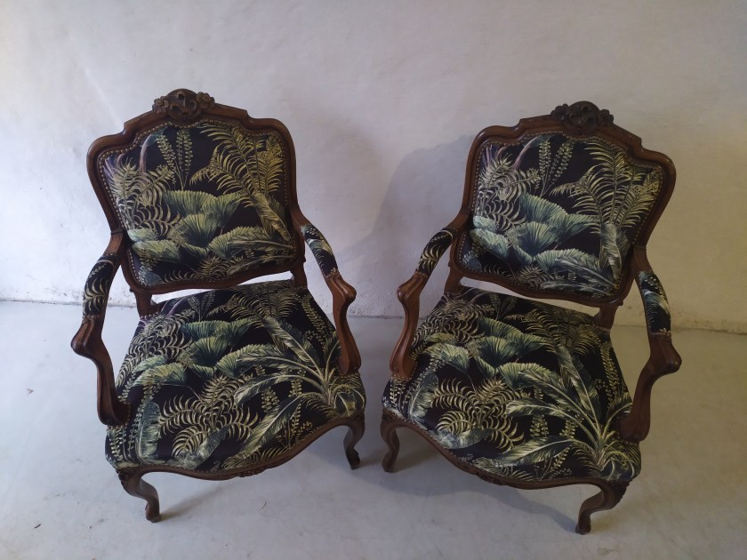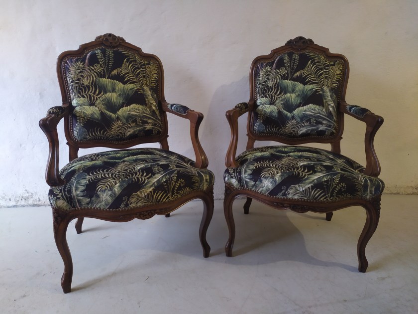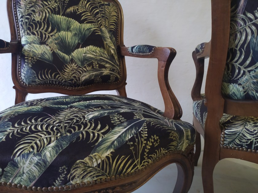 Couverture de cette paire de cabriolet style Louis XV Pose avec un tissu en velours motif fougères de chez « Clarke en Clarke ». Finition clous décoratifs bronze dorés.