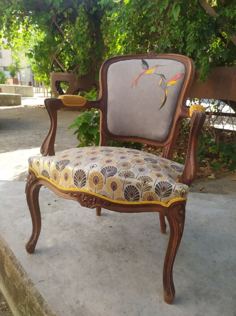 Fauteuil cabriolet Louis XV restauré avec un tissu impression plume dans des couleurs or, jaune et gris.