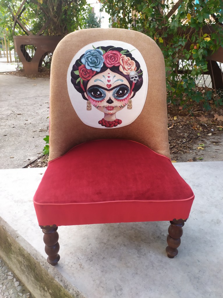 Fauteuil Chauffeuse restauré avec un assemblage de tissu rouge velours pour l’assise, tissu motif géométrique jaune et blanc pour le dossier extérieur et une représentation de Frida Kahlo version « dia de los muertos » assemblé sur un tissu jaune paille.