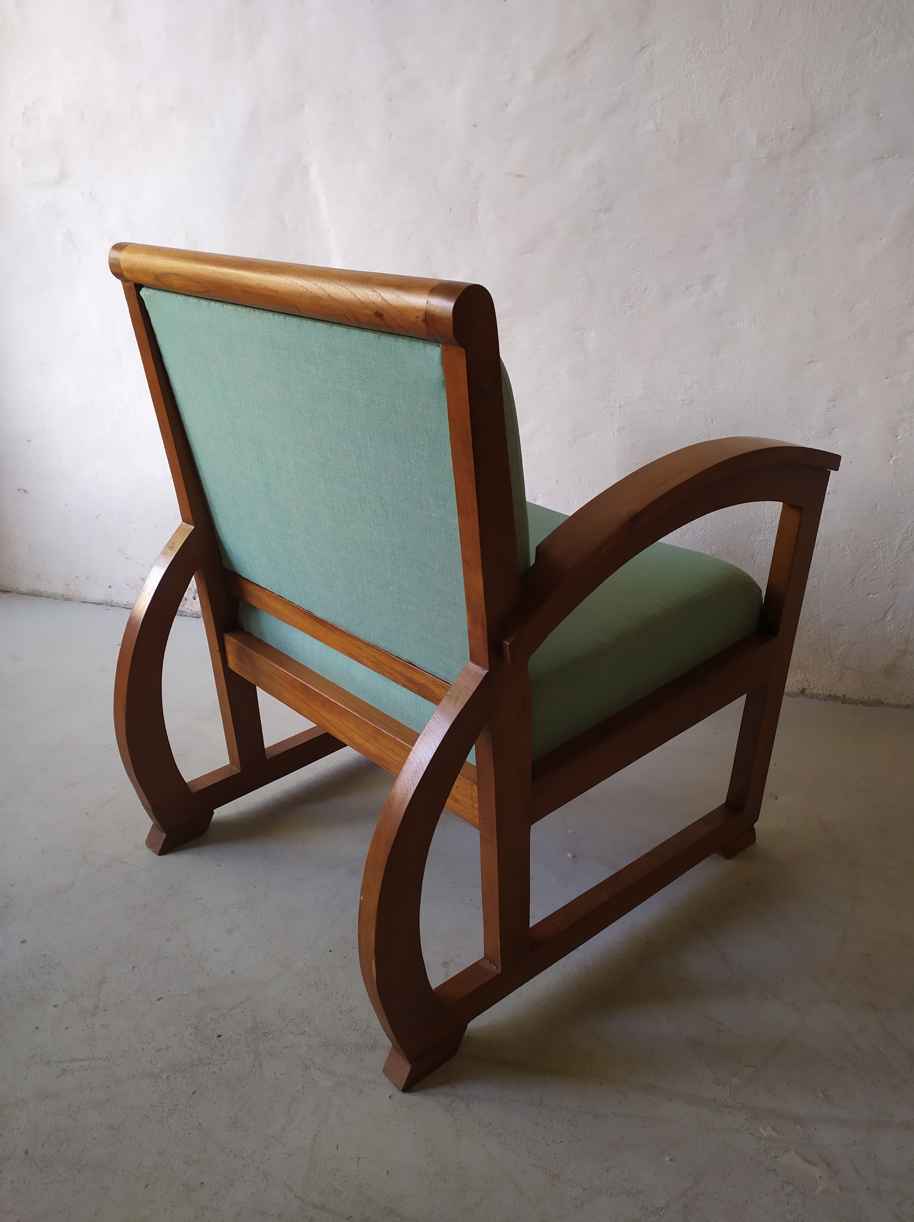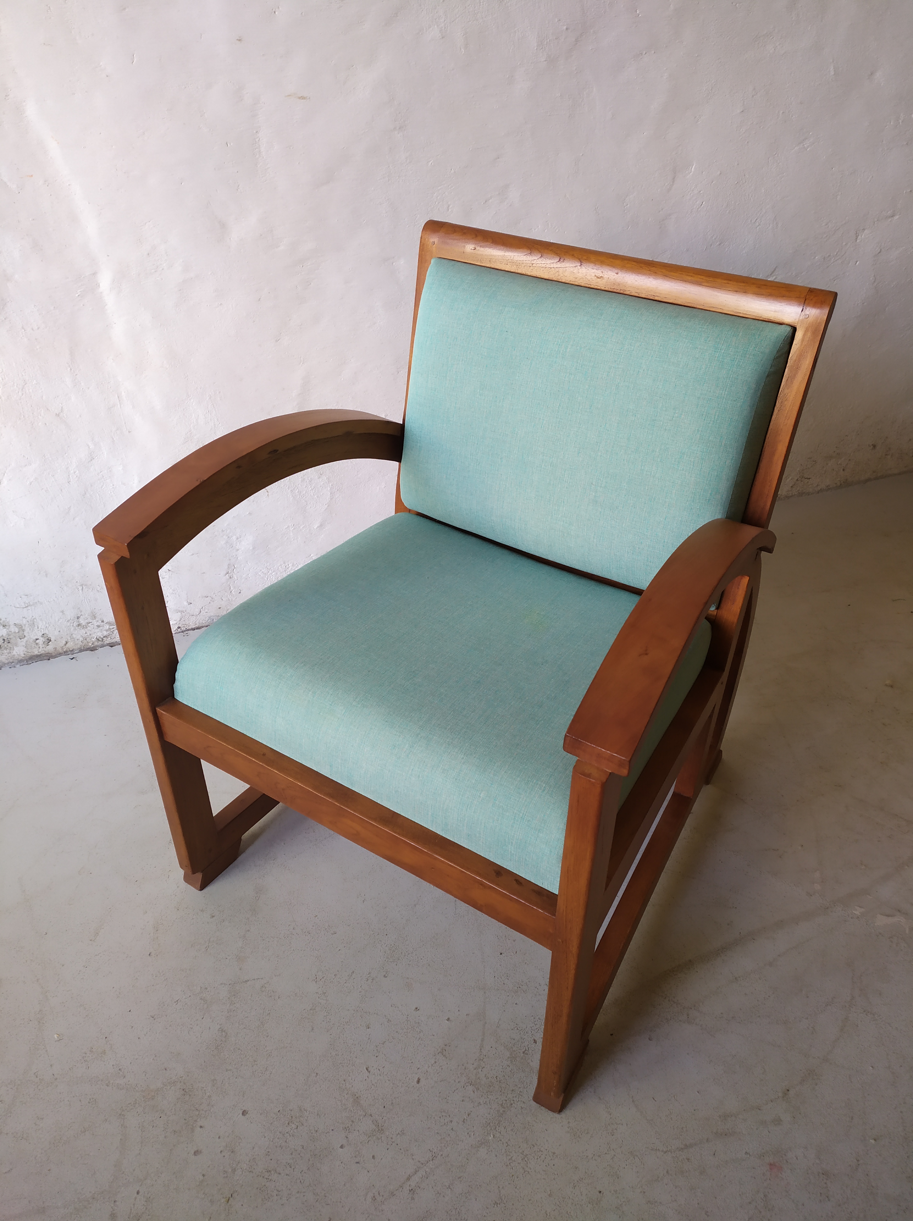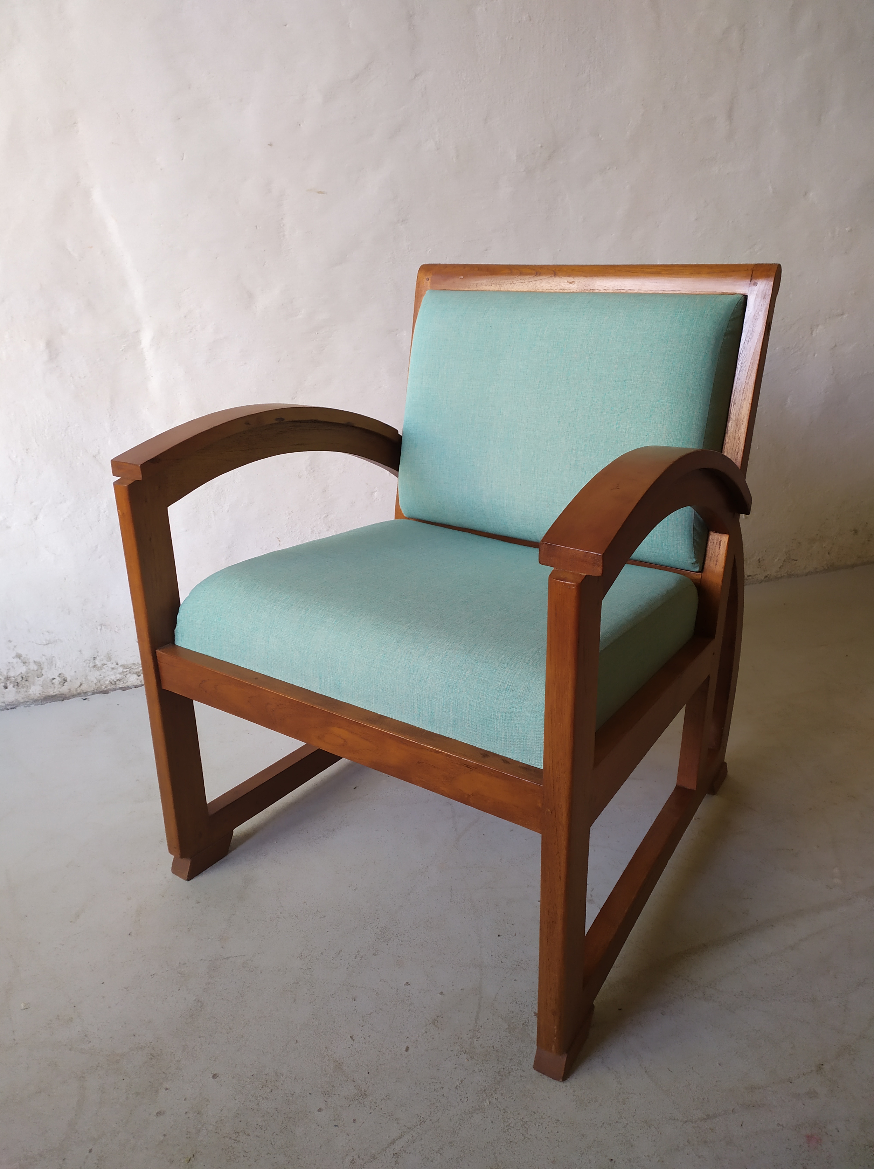 Fauteuil colonial Meubles tissu "classique" Fauteuil de style colonial restaurer avec un tissu anti UV de couleur vert d’eau. N’hésitez pas à me contacter pour plus de renseignements.