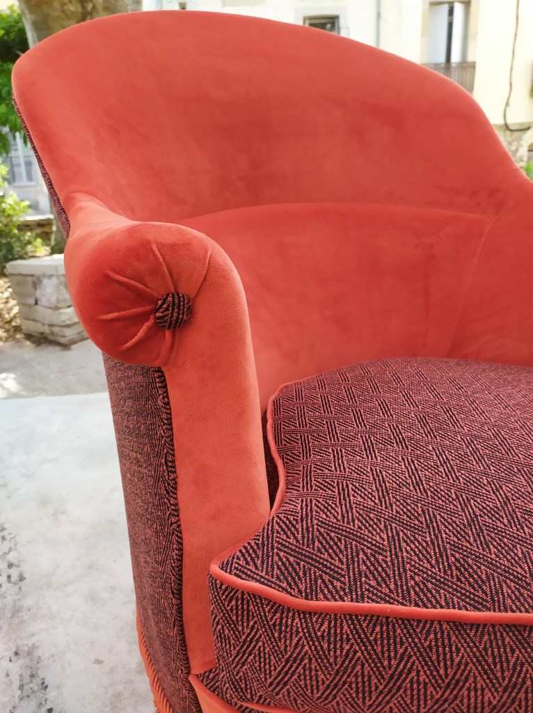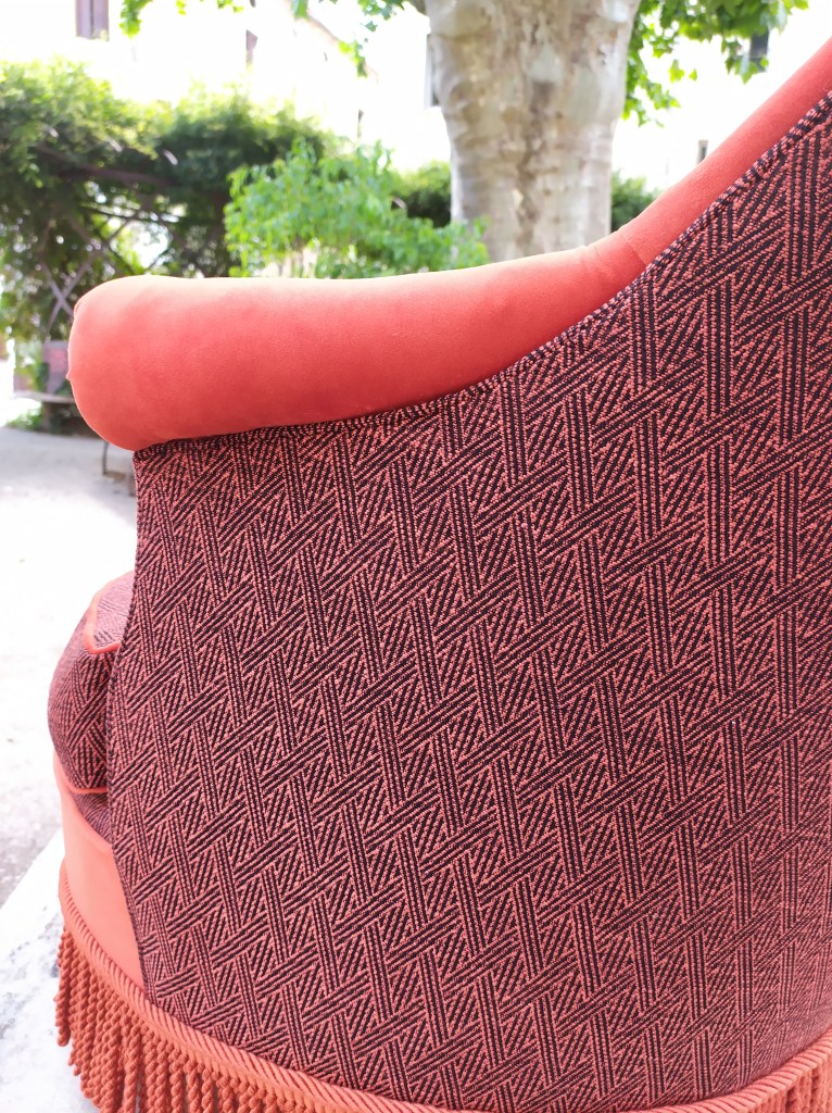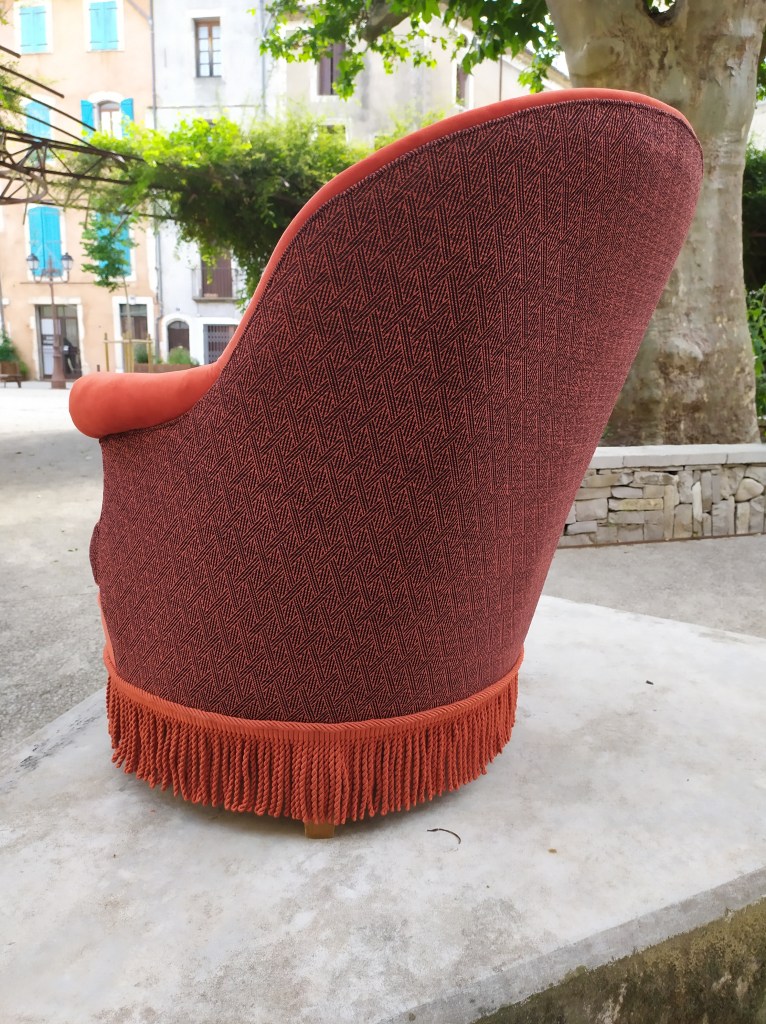 Fauteuil Crapaud à coussin recouvert d’un tissu à motif géométrique en coton de chez Casal et d’un velours de chez Clarke&Clarke le tout dans des tons de orange brique et noir. Finition bas du fauteuil avec une frange et deux boutons recouvert de tissu sur les accotoirs.