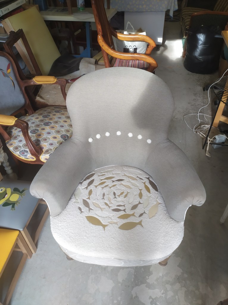 Fauteuil Crapaud restauré avec une application en similicuir de poisson en rond de couleurs or, argent et blanc sur un tissu bouclette blanc.