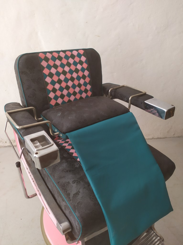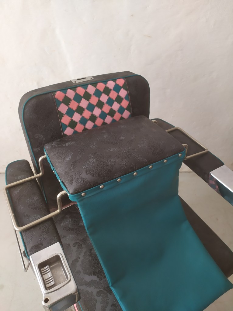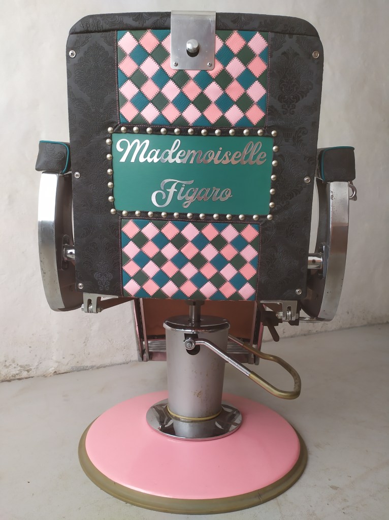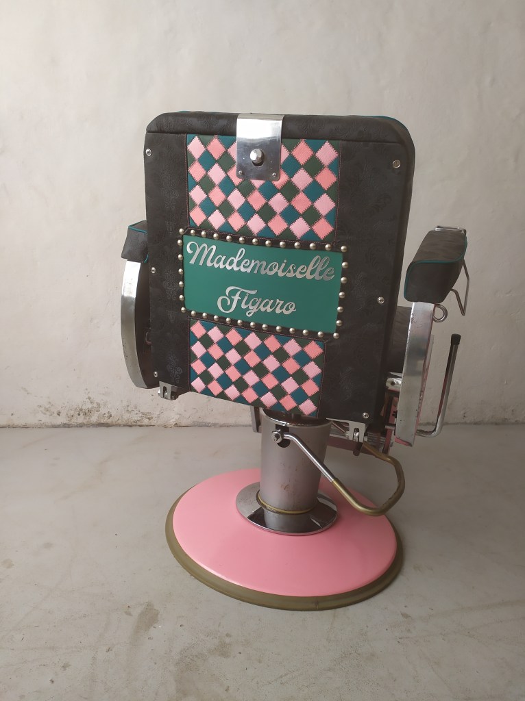 Dossier arrière décoré avec « Mademoiselle Figaro » découpé dans une plaque de plastique effet métal réalisé avec une machine laser chez Hexagence à Molière-Cavaillac (30). Lettrage appliqué sur une peinture verte puis entouré de clous décoratifs argenté et du tissu patchwork et similicuir baroque.