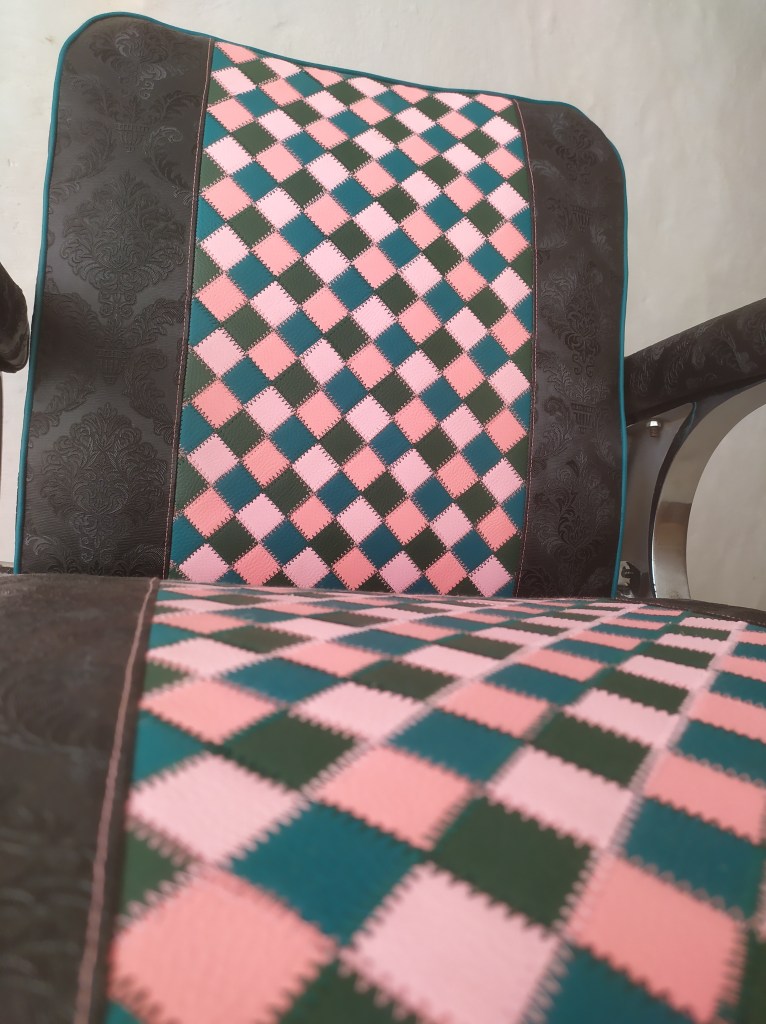 Création d’un tissu en patchwork de similicuir dans des tons de roses et verts assemblé avec des coutures en zigzag roses et vertes. Cette création de patchwork est harmonieusement mélangé avec un similicuir noir imprimé d’un motif baroque ton sur ton.