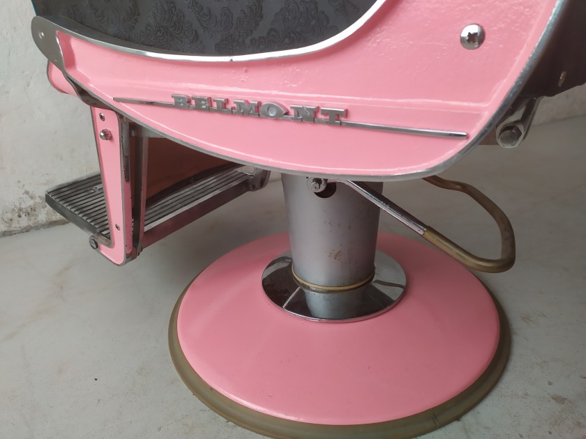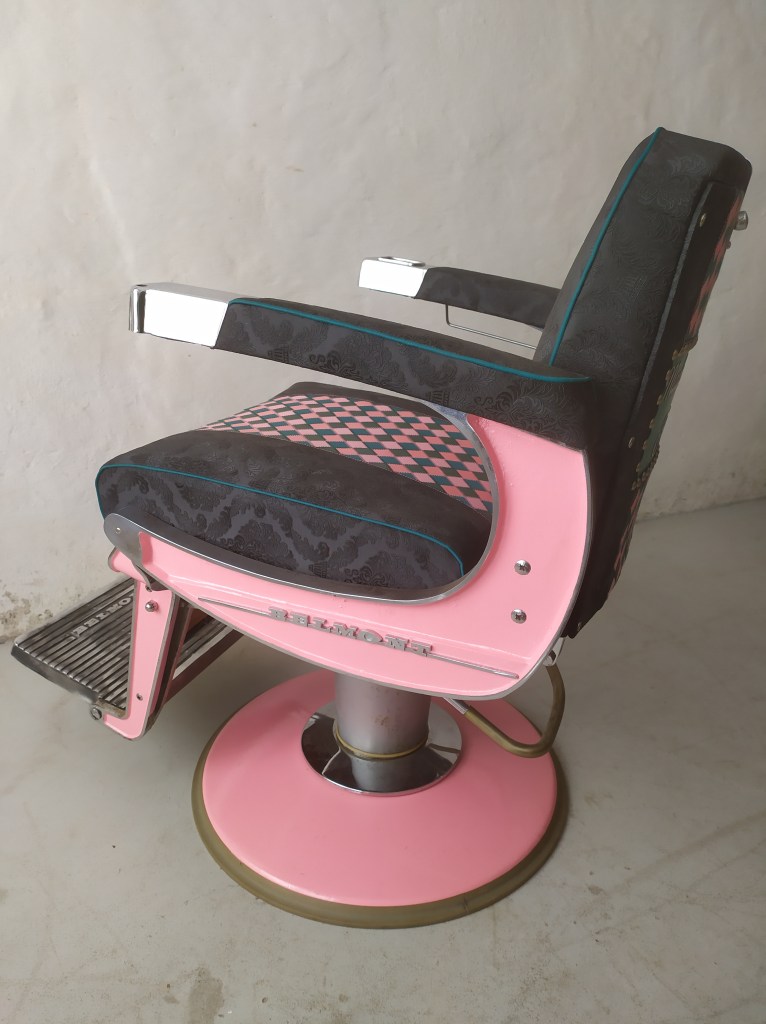 Véritable fauteuil de barbier des années 50 inclinable et réhaussable avec un cendrier sur un des accotoirs ainsi qu’un siège amovible pour les enfants.