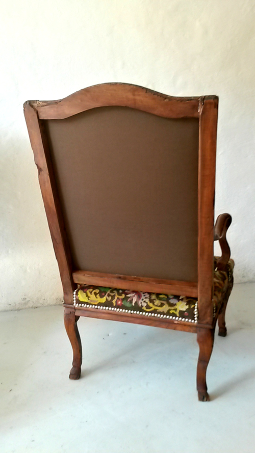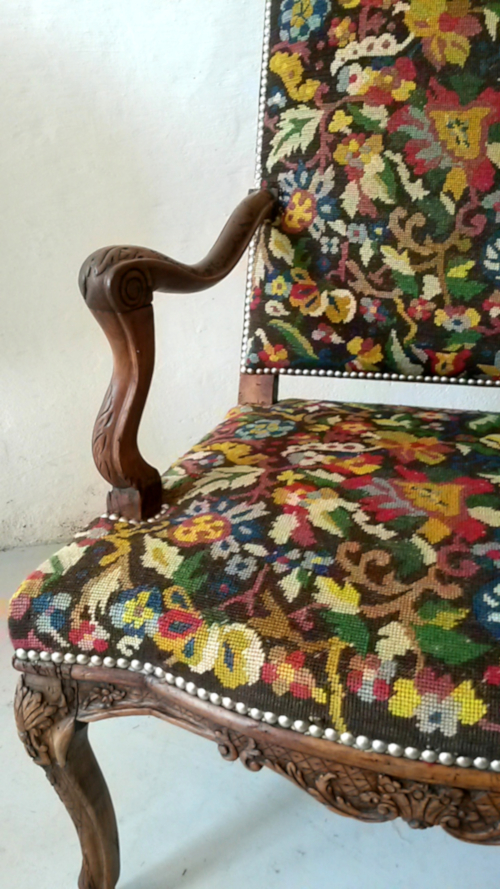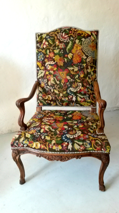 Fauteuil Louis XIV Meubles tissu "classique" Réfection complète de la garniture de façon traditionnelle, restauration du bois et du tissu en canevas d’origine.Finition clous décoratifs argentés.