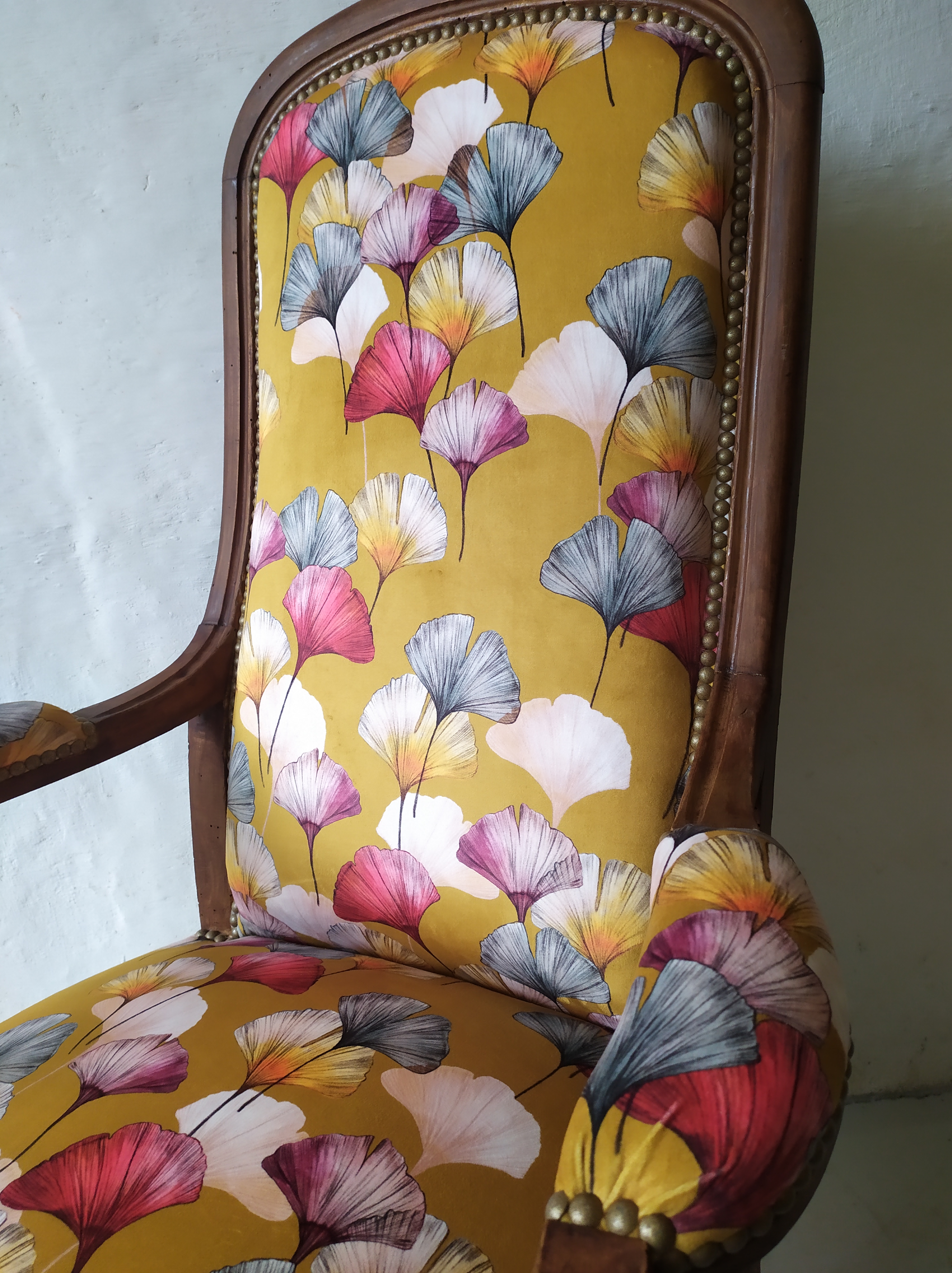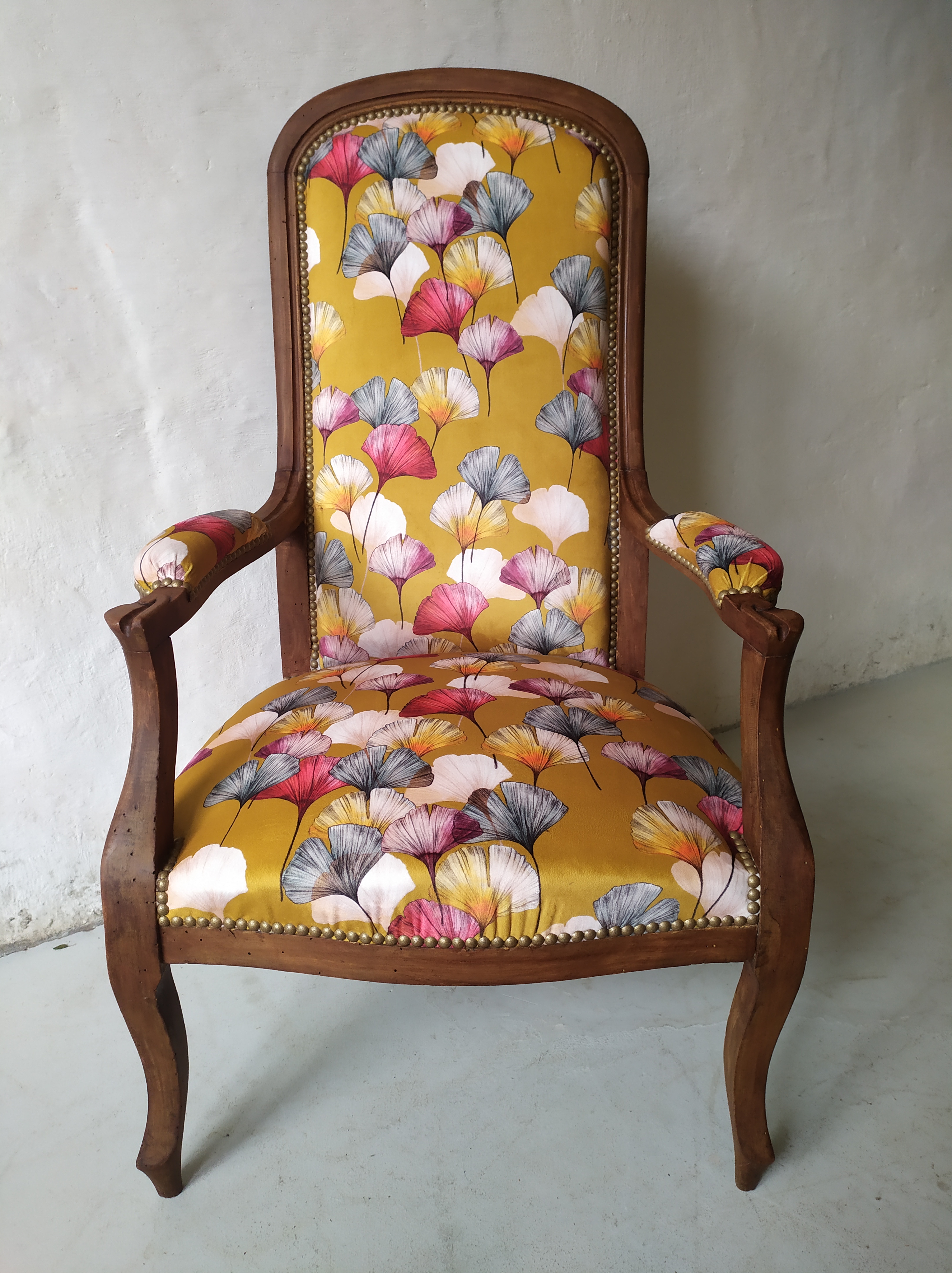 Fauteuil voltaire entièrement restauré avec une garniture traditionnelle en crin et ressort. Pose d’un tissu en velours au motif de feuilles de ginkobiloba multicolores sur un fond jaune. Finition clou décoratifs bronze doré.