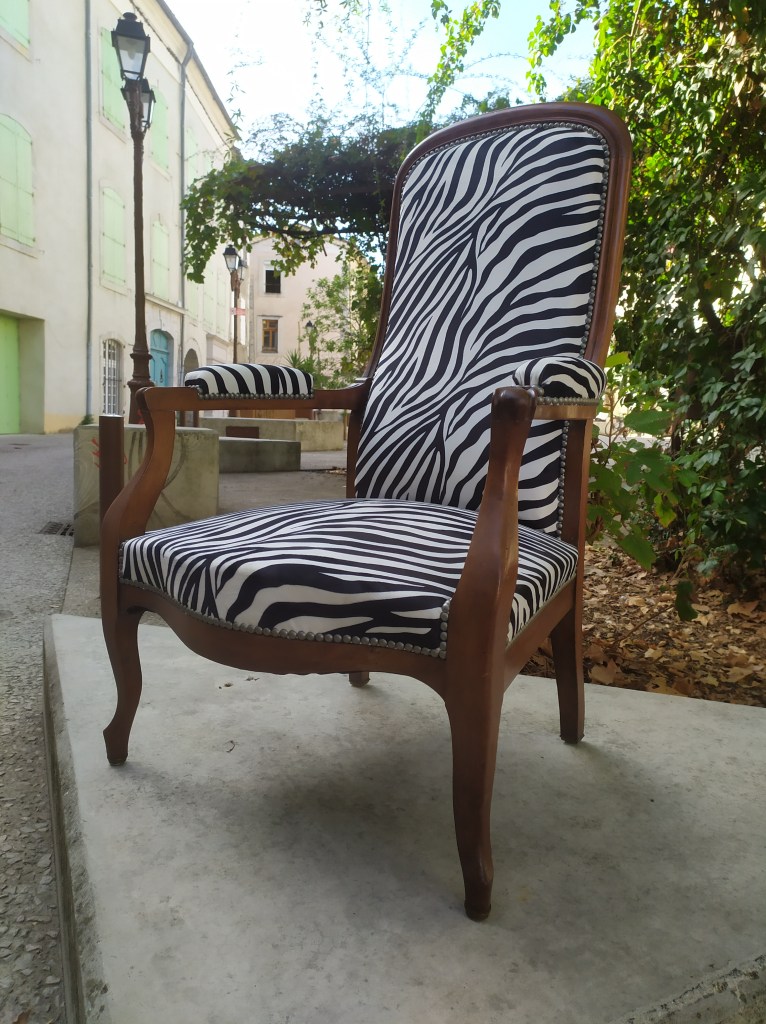 Fauteuil Voltaire Meubles tissu "classique" Fauteuil Voltaire restauré avec un tissu zèbre en velours.Finition clous décoratifs étain N’hésitez pas à me contacter pour plus de renseignements.