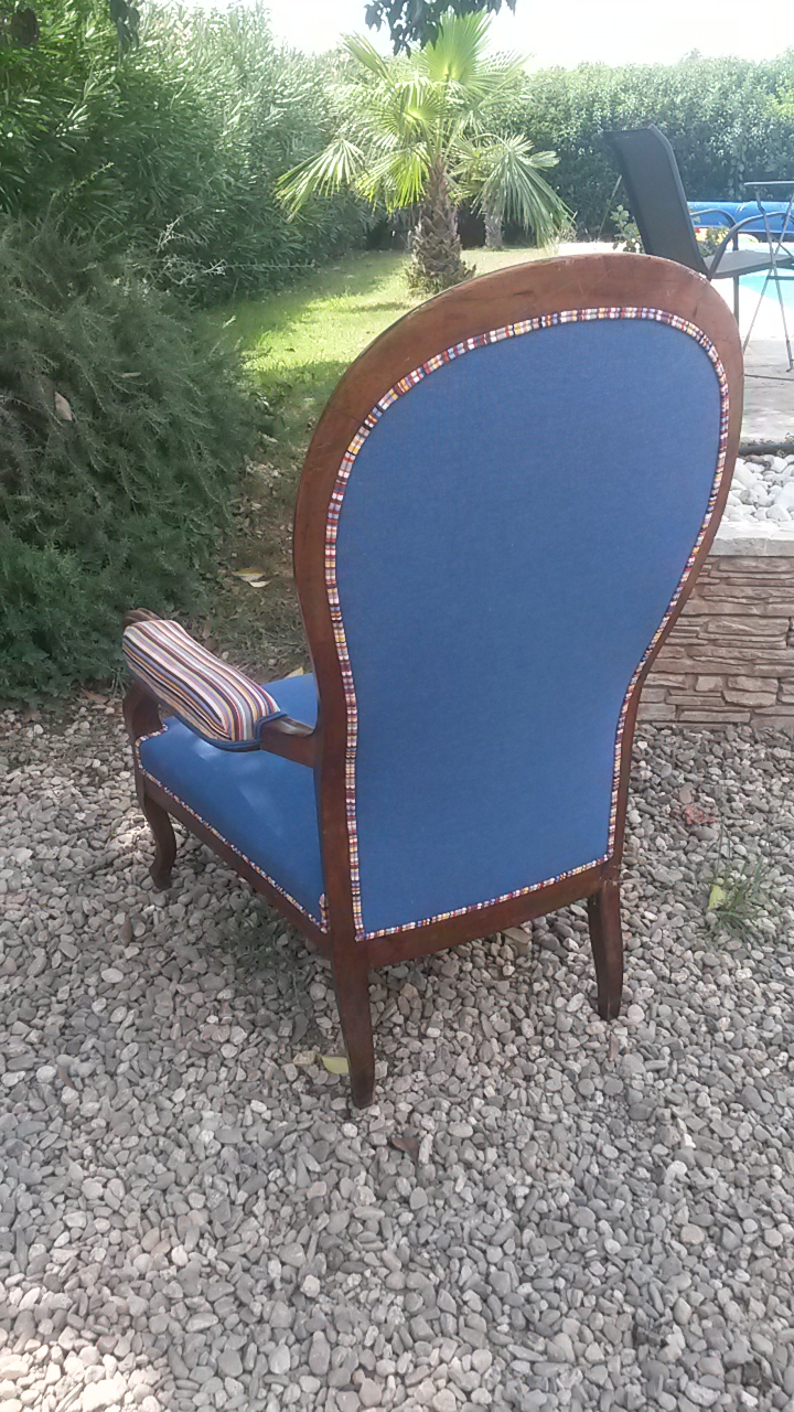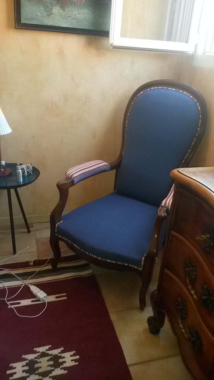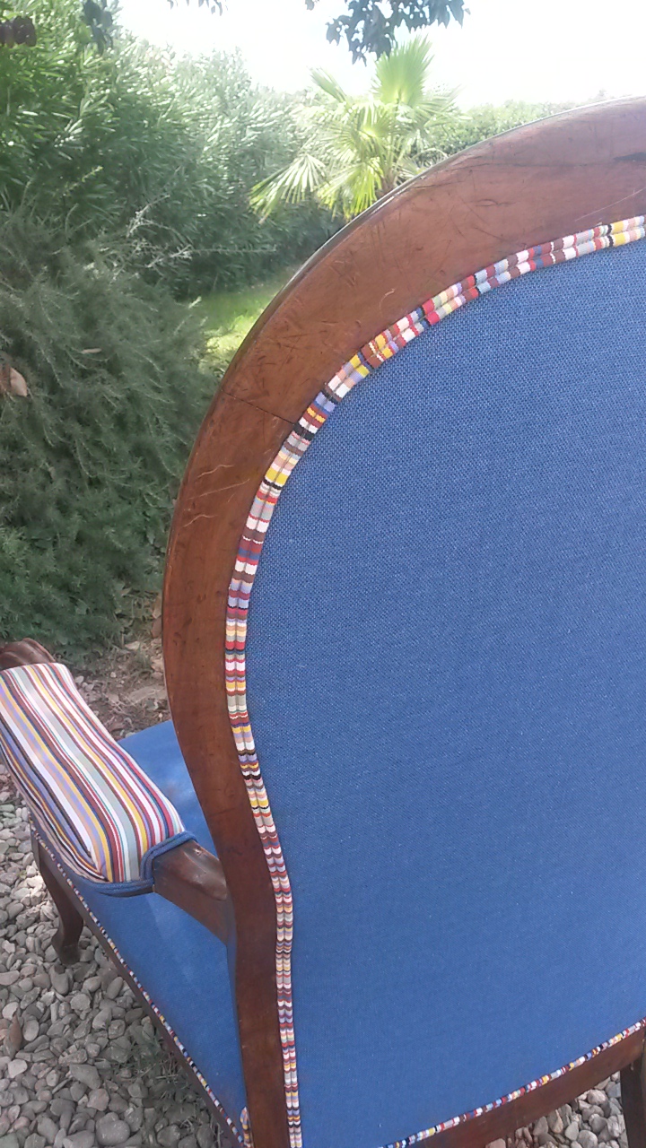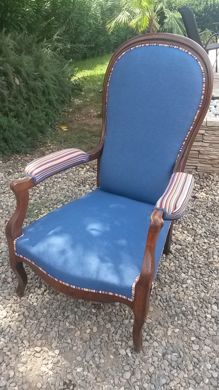 Fauteuil Voltaire Meubles tissu "classique" Pose d’un tissu « Les Toiles du Soleil » bleu jean et à fines rayures multicolores.Finition double passepoil.