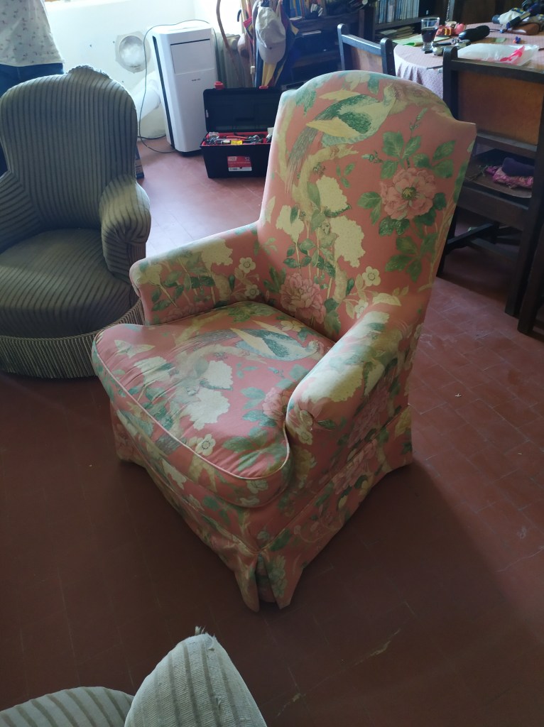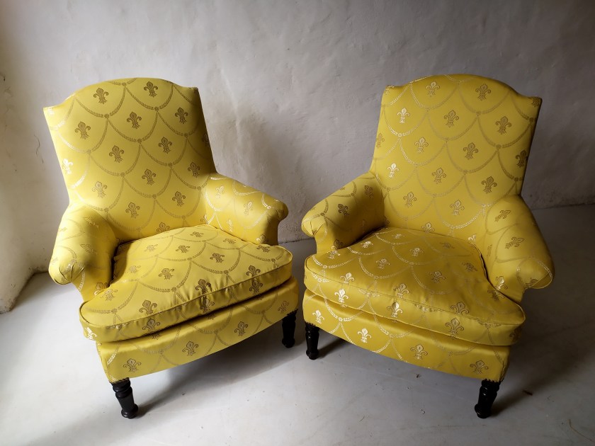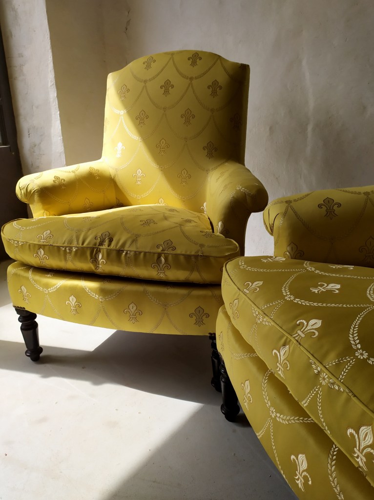 Paire de fauteuil anglais à coussin recouvert d’un tissu style empire motifs fleurs de lys satiné jaune et or de chez CASAL. Bois peint en noir.