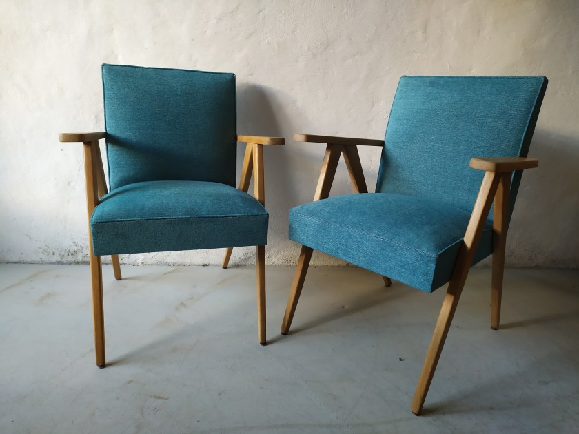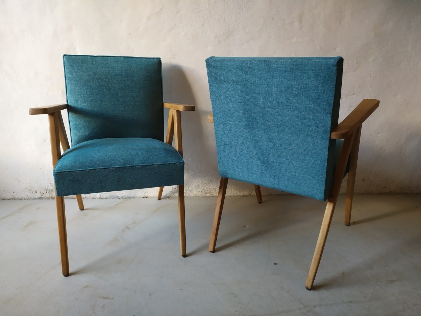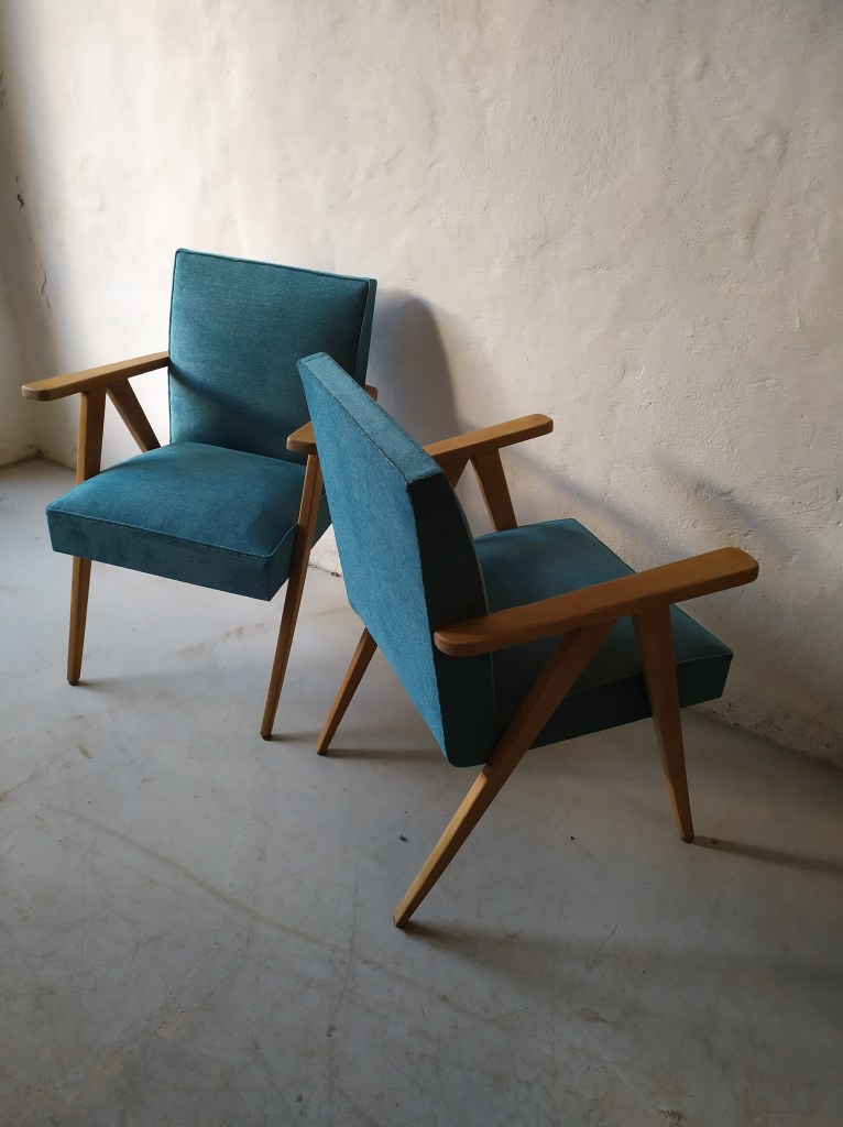 Fauteuils Bridge Meubles tissu "classique" Paire de fauteuils Bridge années 50 recouvert d’un tissu bleu canard de chez Casal. Bois poncé et ciré.