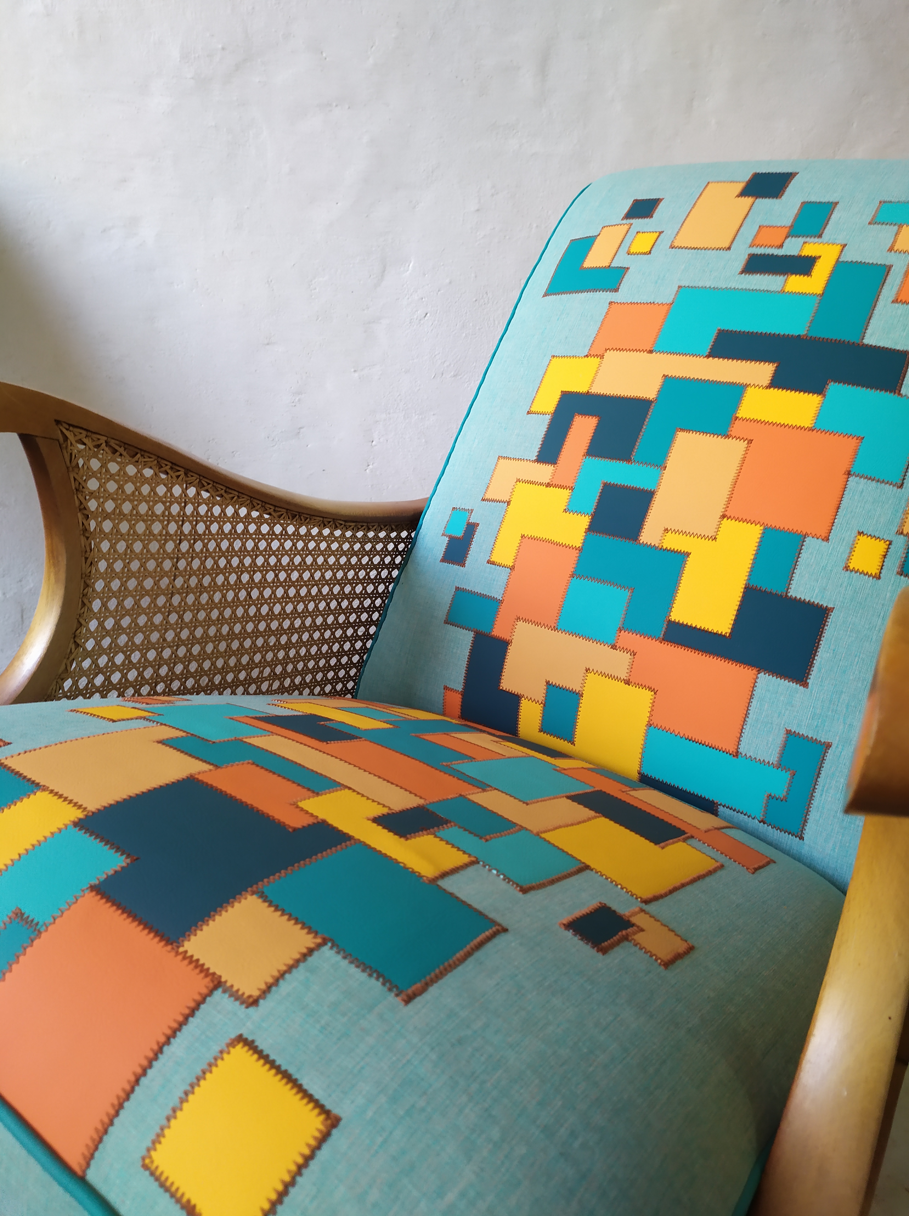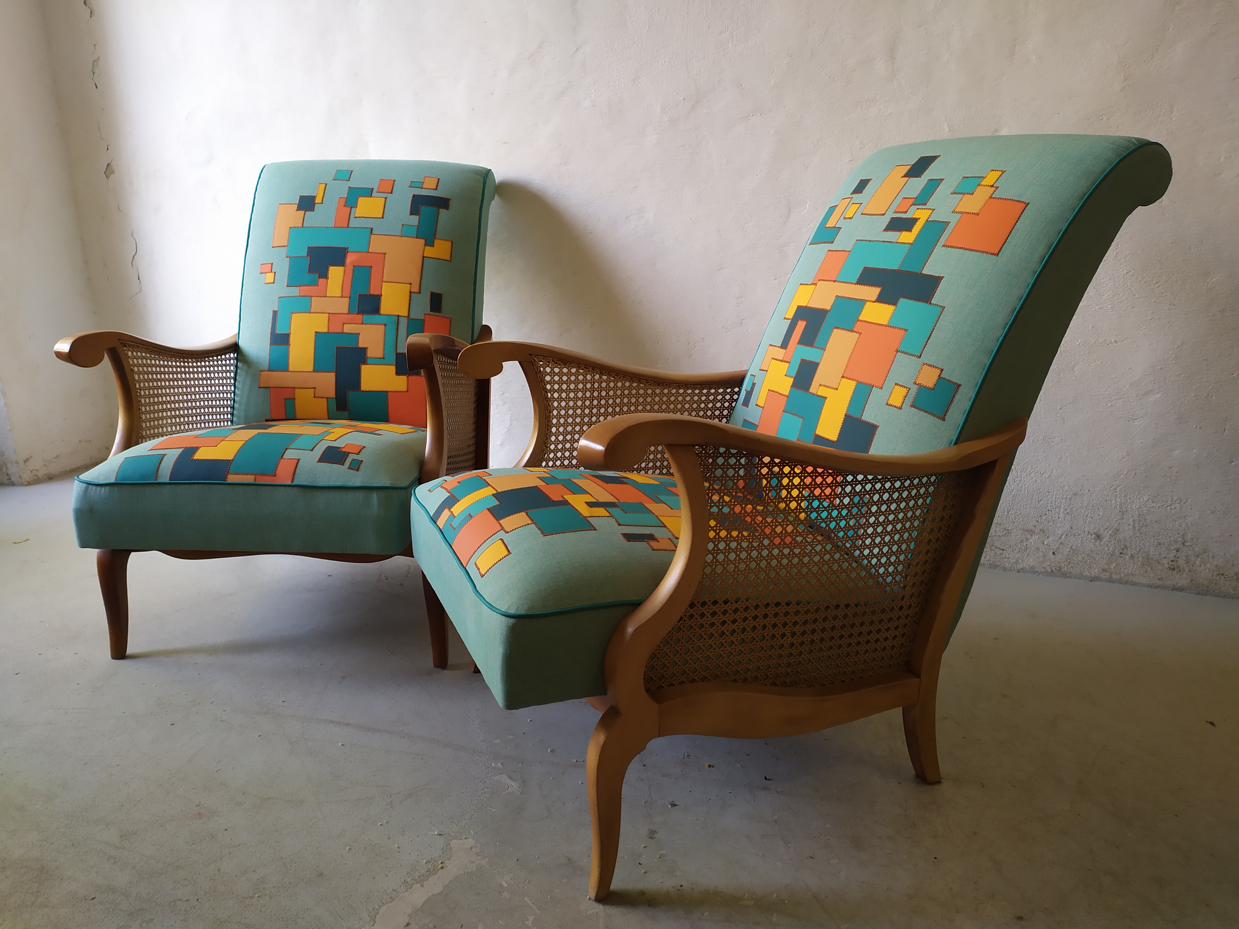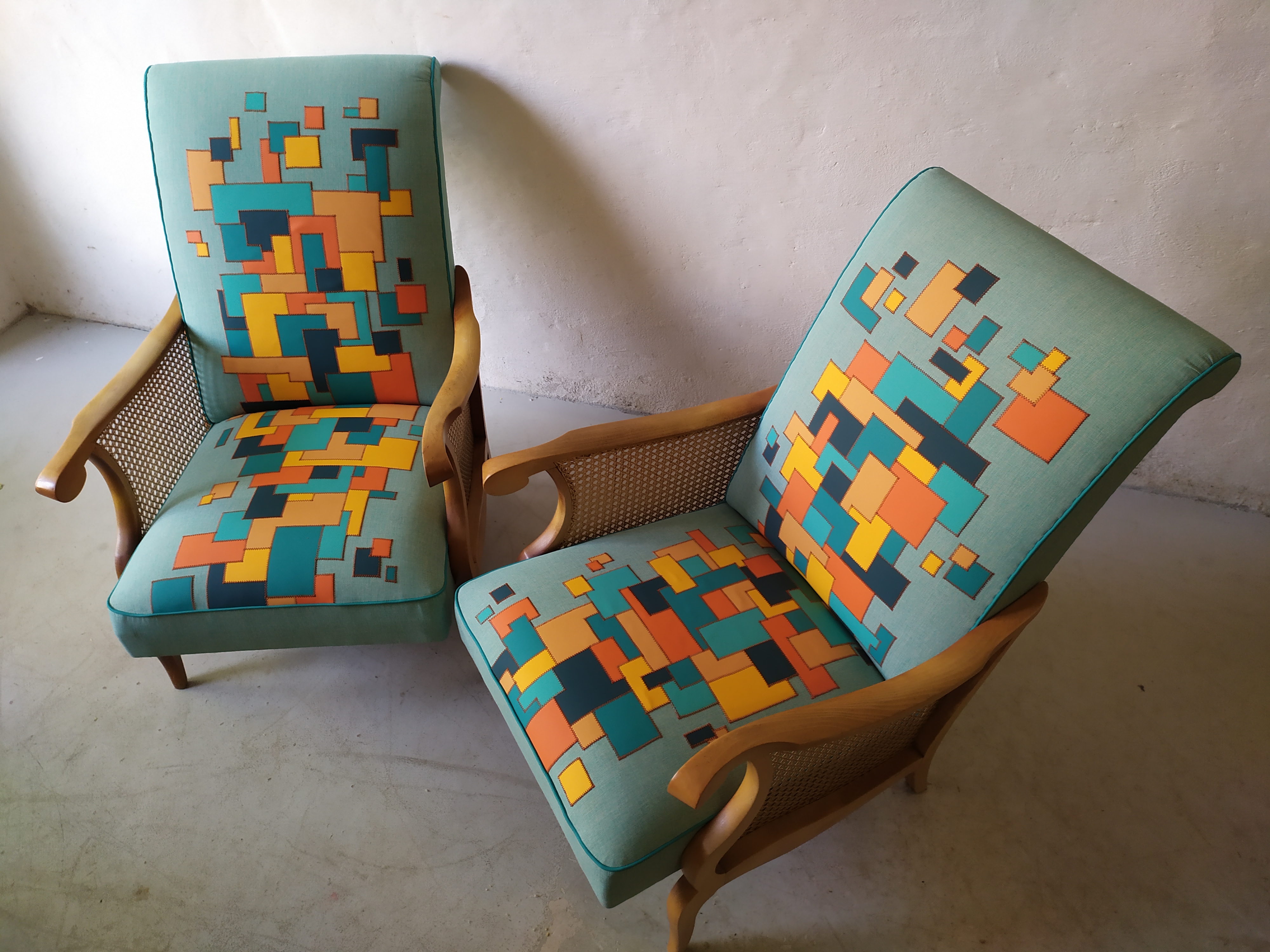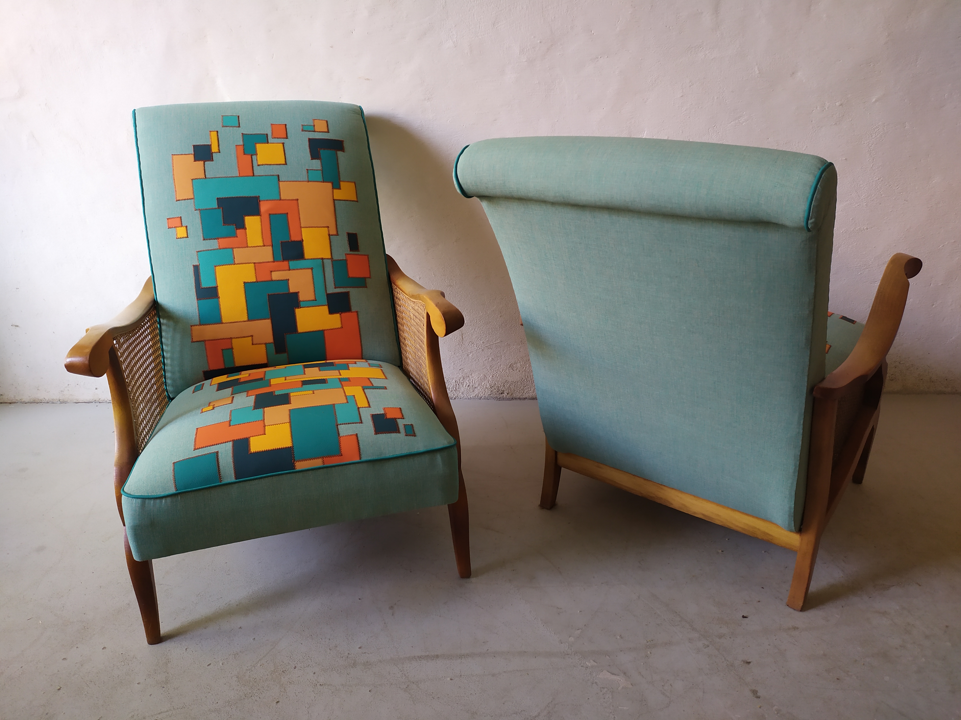 Paire de fauteuils restaurés avec une création de tissu en patchwork de similicuir appliqué sur un tissu anti UV vert d’eau. Dans un mélange de bleu et orange assemblé avec des coutures couleur briques, finition en passepoil bleu canard.