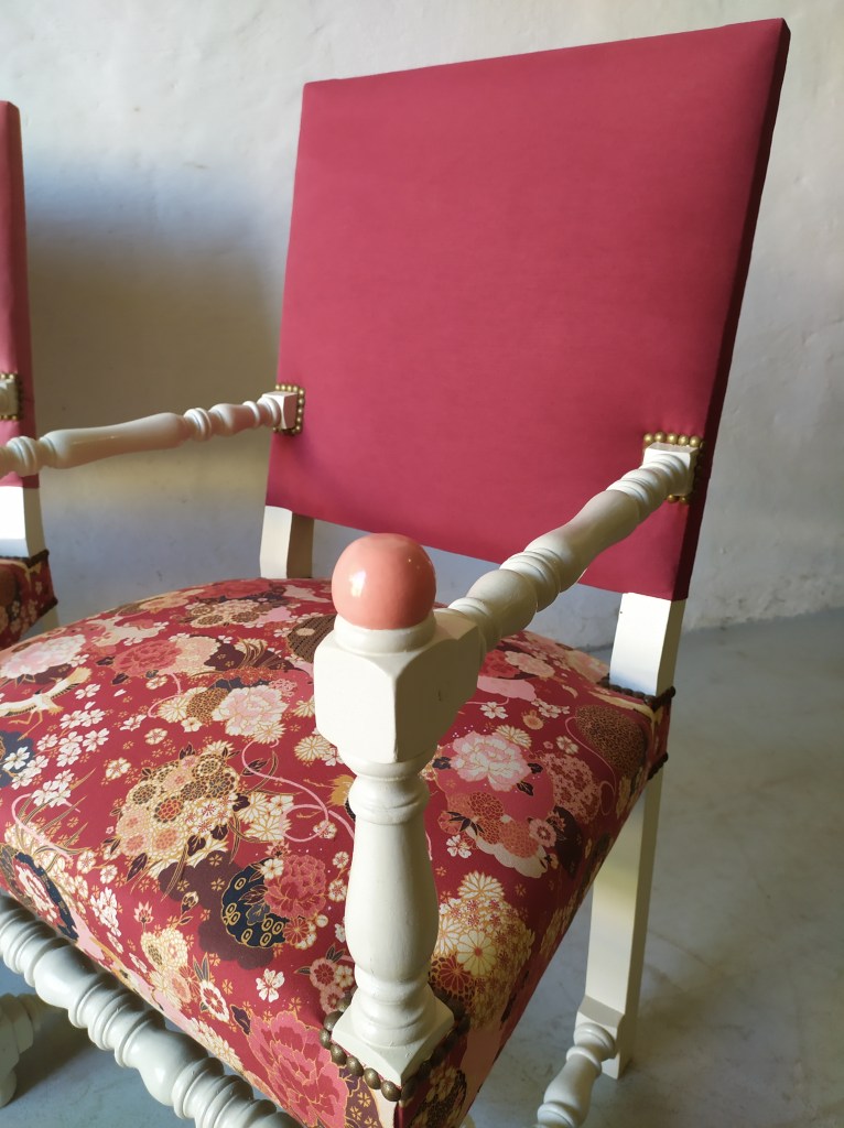Paire de fauteuils Henri IV relookés avec un tissu aux motifs japonnais assemblés avec des tissus unis différents sur les dossiers intérieur pour alléger l’ensemble.