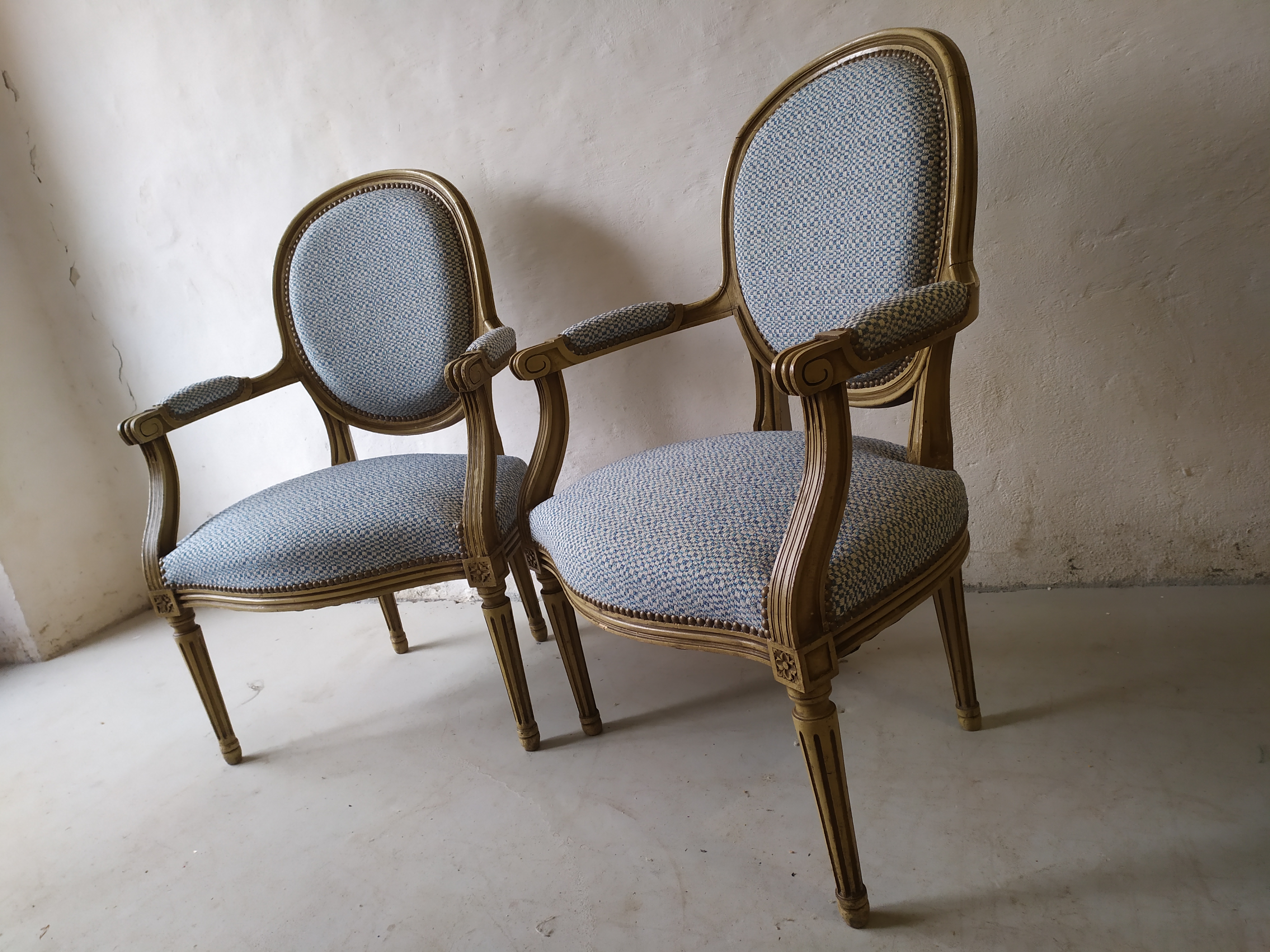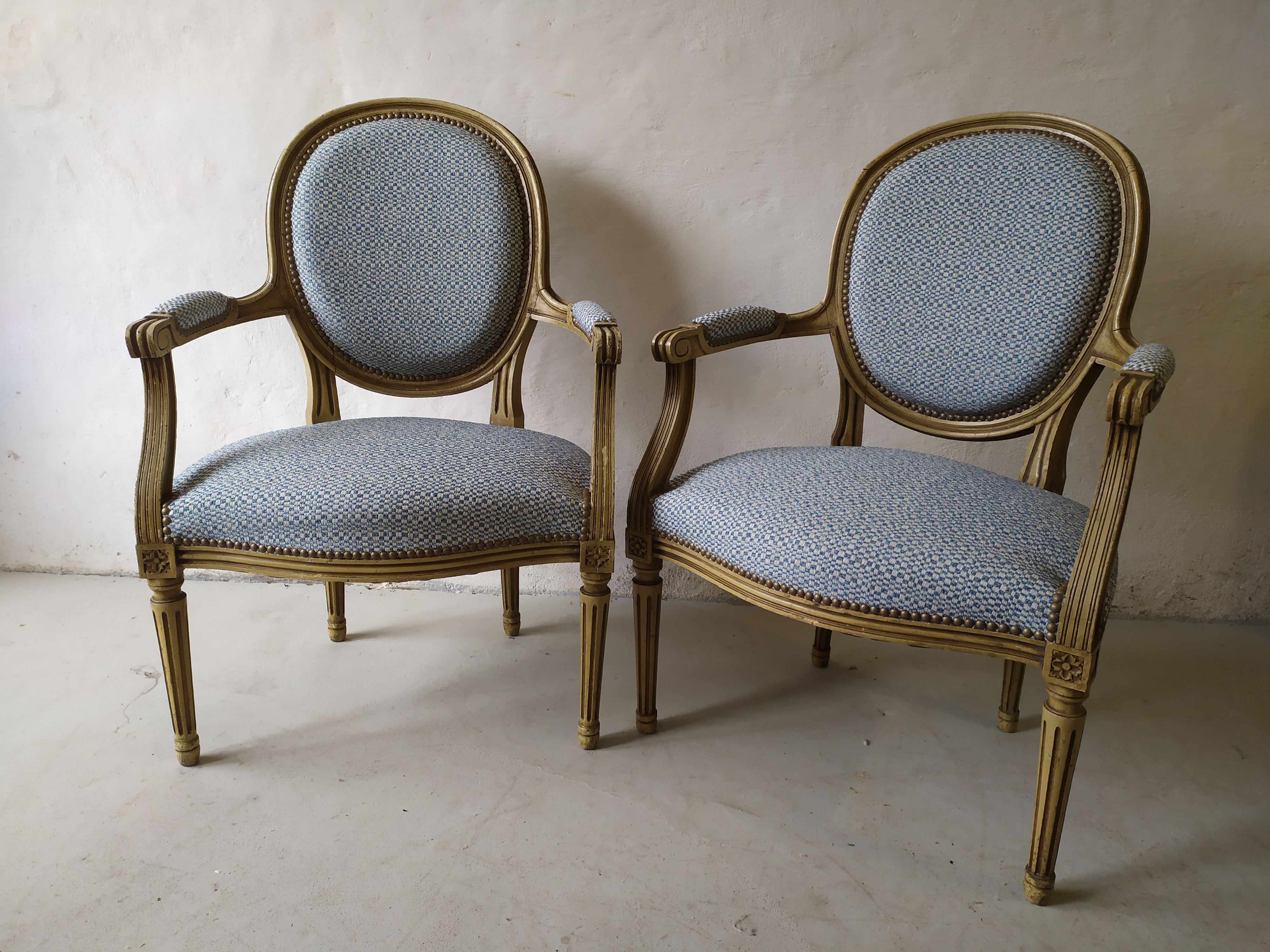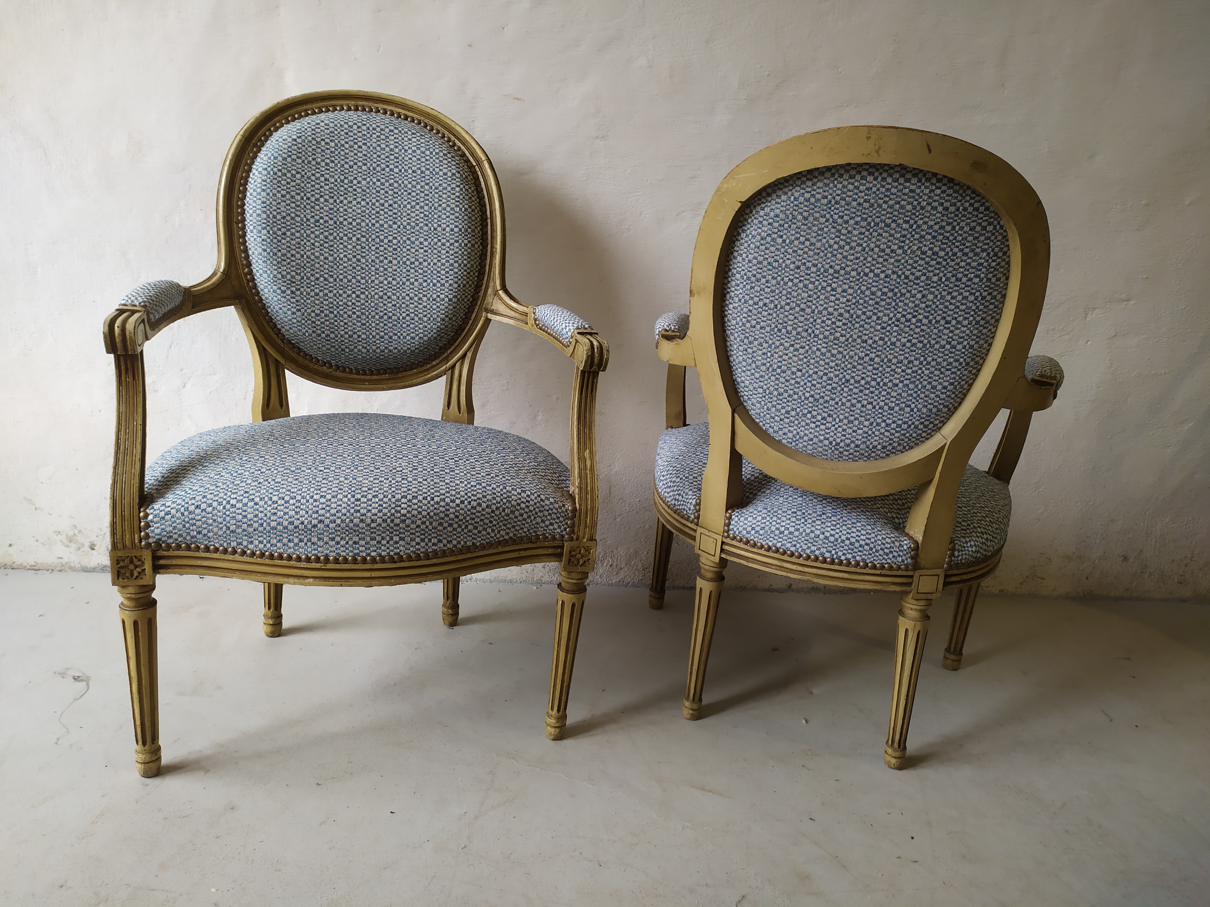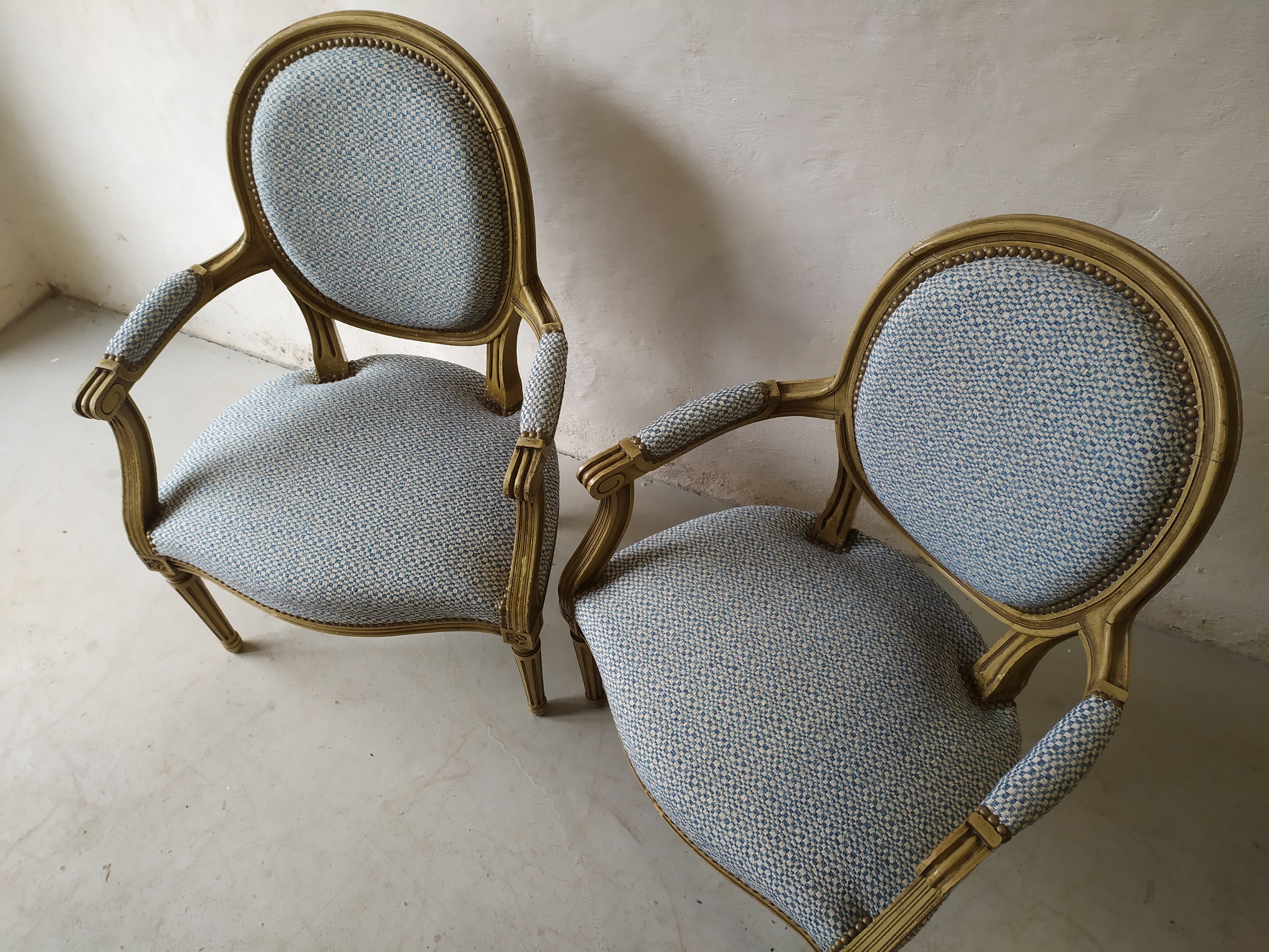 Fauteuils Louis XVI Meubles tissu "classique" Paire de fauteuils Louis XVI dossiers médaillons. Garniture des assises restaurées et pose d’un tissu gros tissage bleu et blanc. Finition clous décoratifs bronze doré. N’hésitez pas à me contacter pour plus de renseignements.