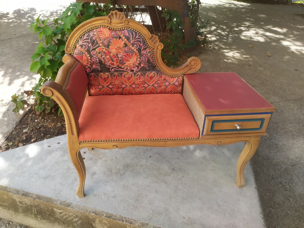 Meuble téléphone restauré un tissu couleur brique pour l’assise, le dossier extérieur et l’accotoir.