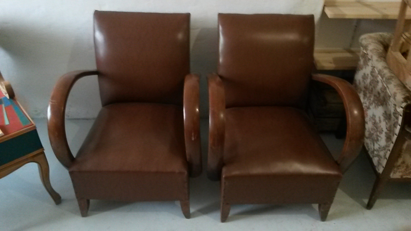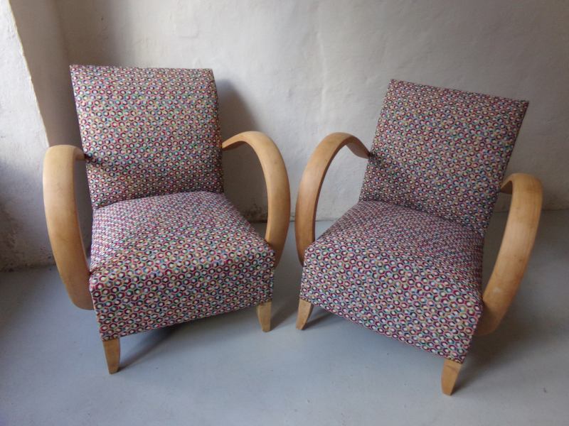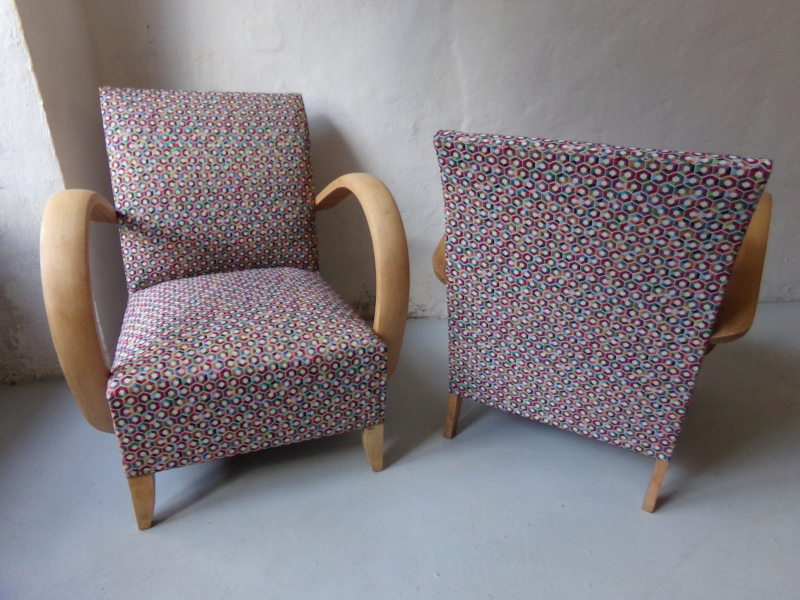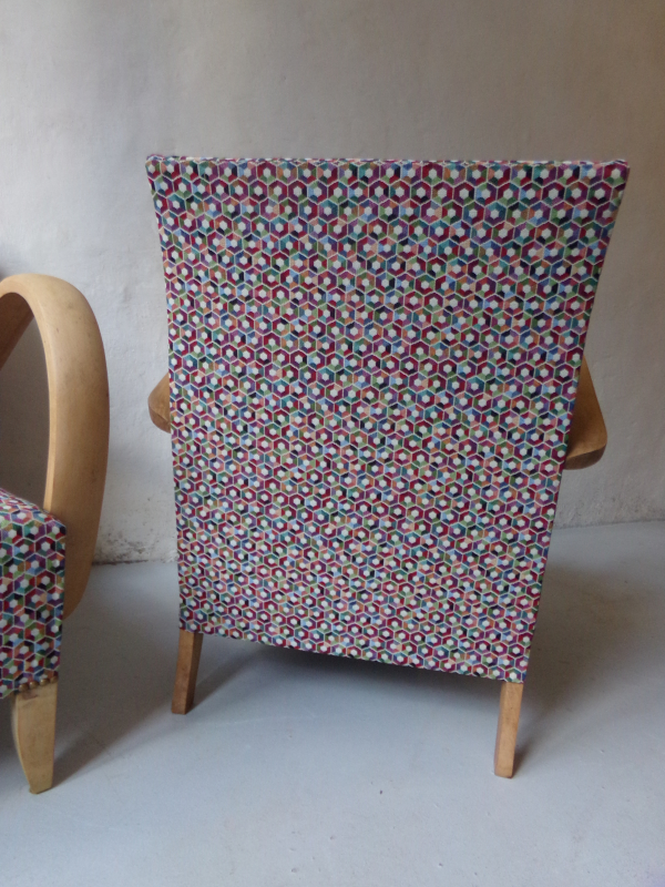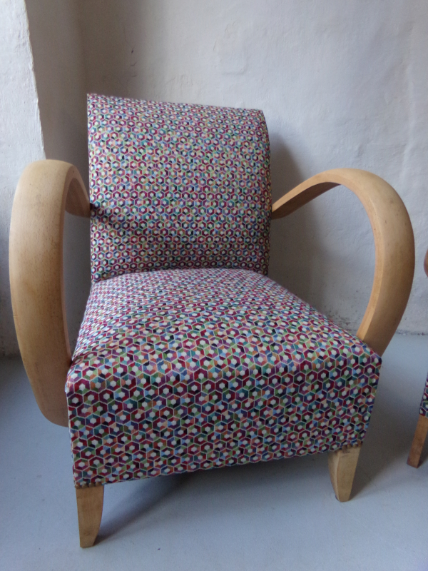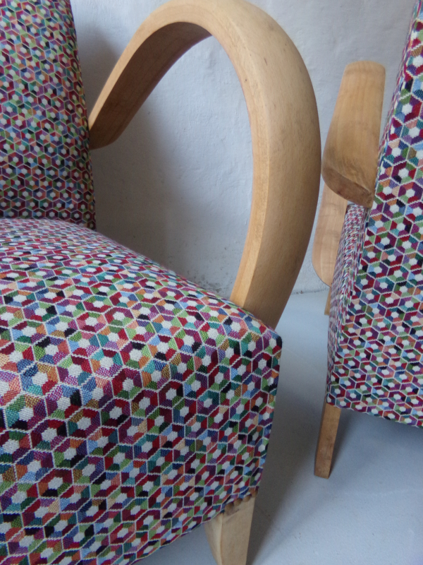 Paire de fauteuils Bridge Meubles tissu "classique" Changement de couverture avec un tissu motifs hexagone multicolore. Bois décapé et ciré.