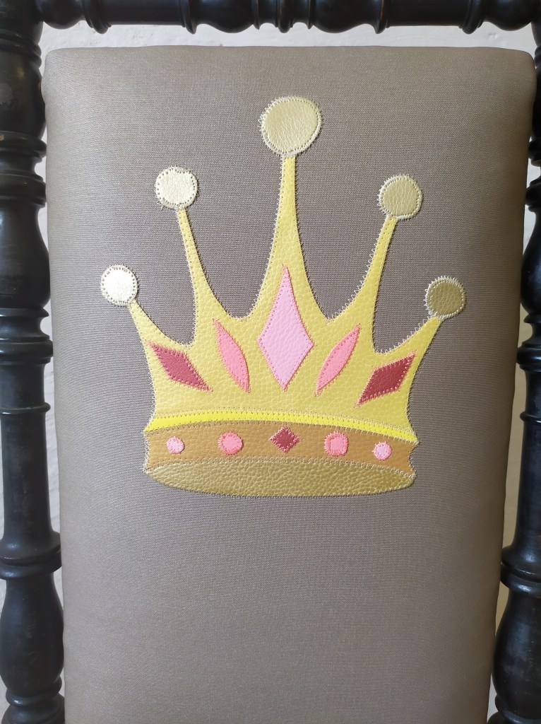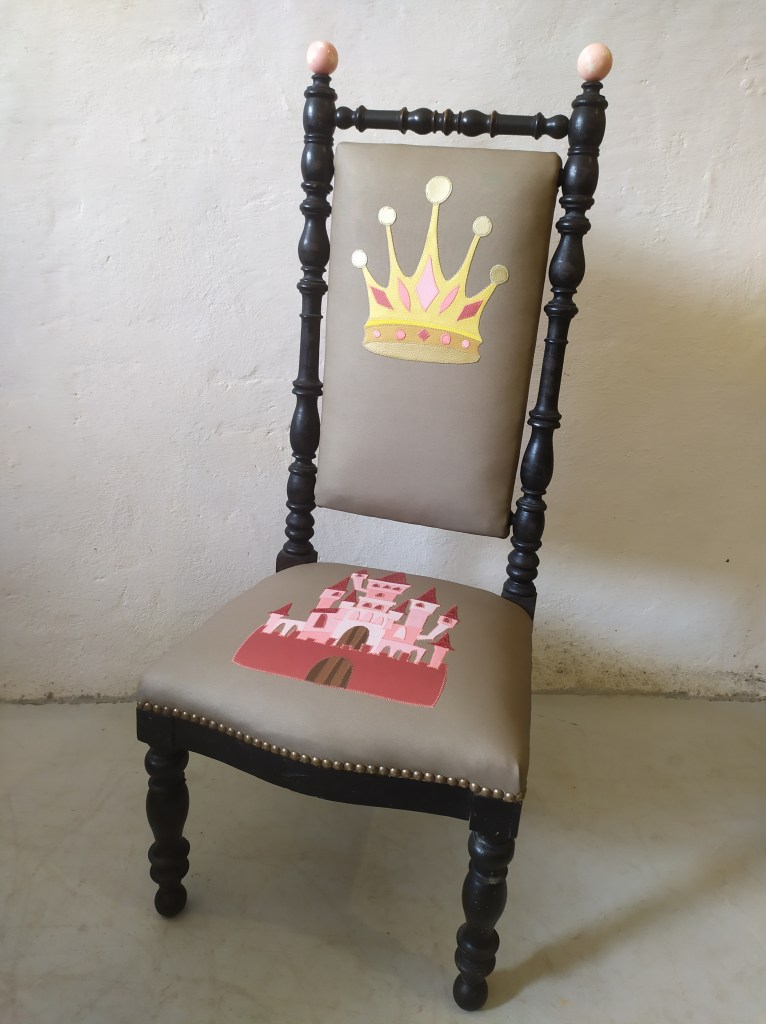 Chaise prie dieux où la manchette sur le dossier était manquante. Création de tissu en patchwork de similicuir représentant un château sur l’assise et une couronne sur le dossier.