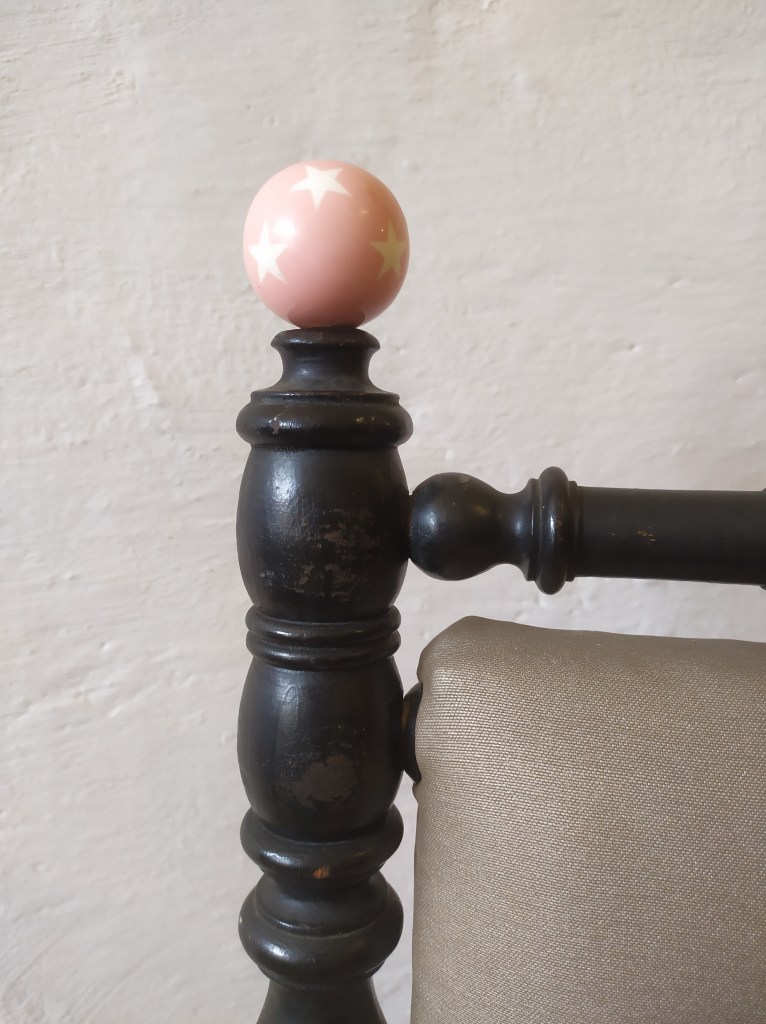 Finition des montants du dossier avec des boutons de porte rose à étoile.