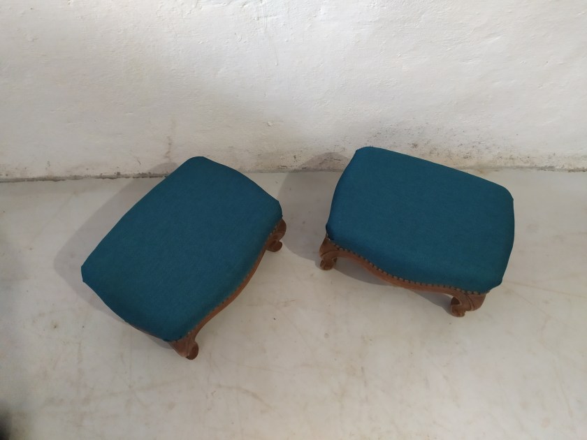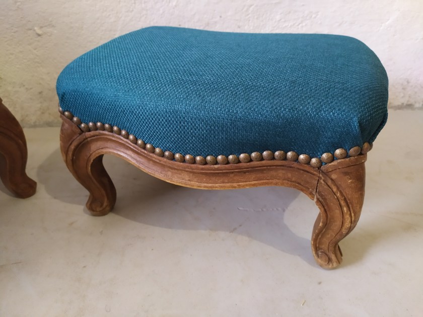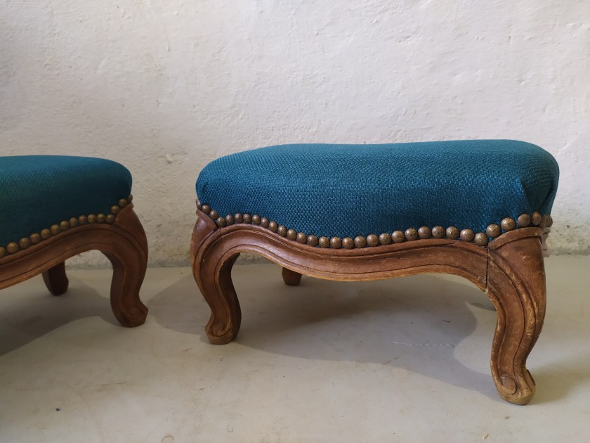 Repose pieds Meubles tissu "classique" Paire de reposes pieds restaurés avec un tissu bleu canard et une finition clous décoratifs bronze dorés.