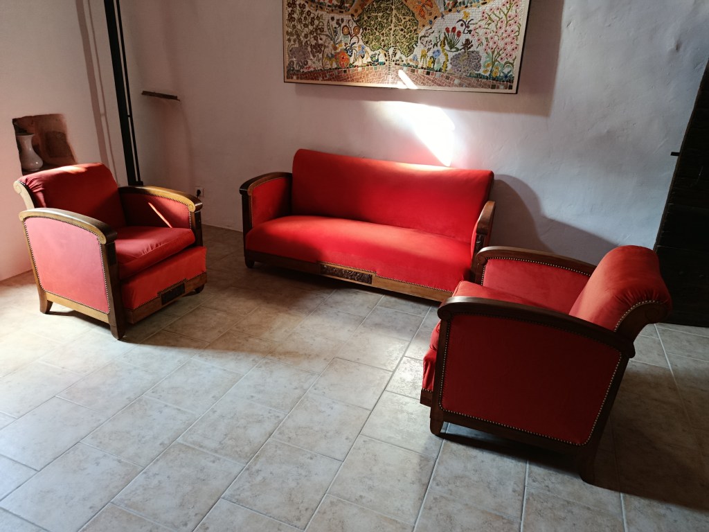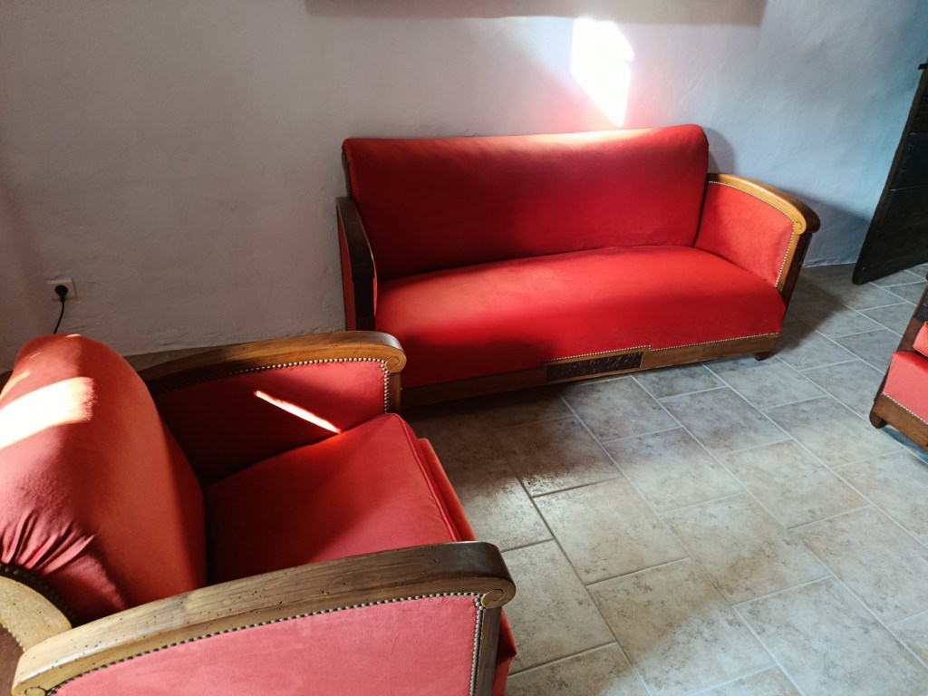 Salon Art Déco Meubles tissu "classique" Salon Art Déco habillé d’un tissu orange vif en velours.Finition clous décoratifs bronze doré. N’hésitez pas à me contacter pour plus de renseignements.