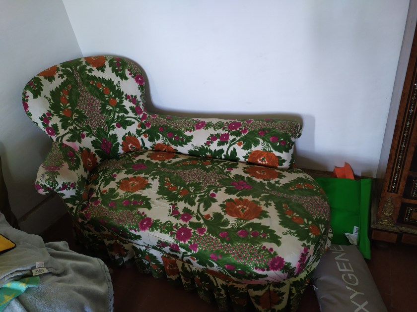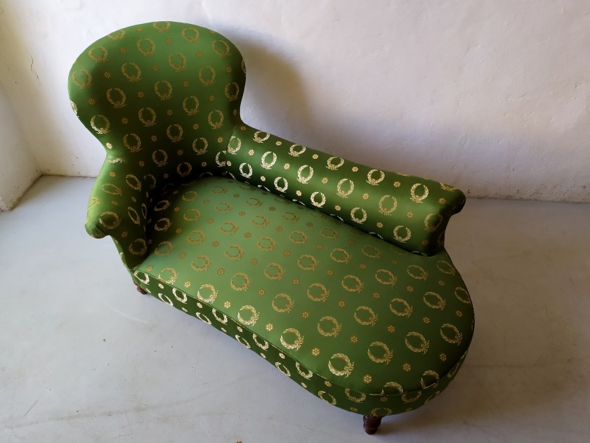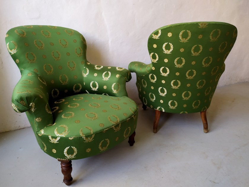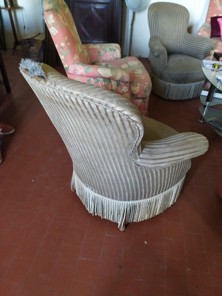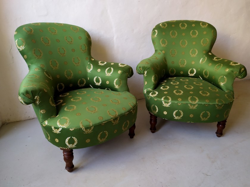 Salon composé d’une méridienne et de deux fauteuils crapaud en garniture traditionnelle crin et ressorts.