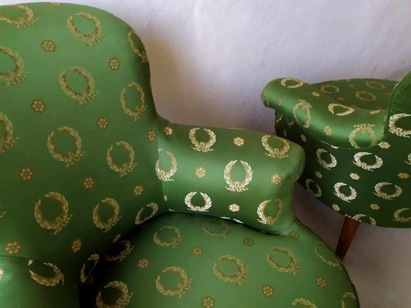 Couverture avec un tissu style empire motifs couronnes satiné vert et or de chez CASAL. Bois peint en noir.