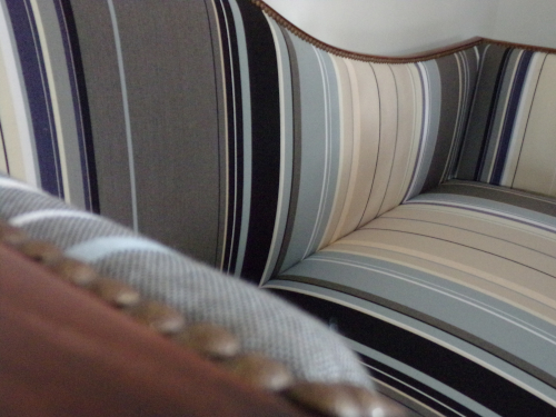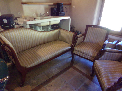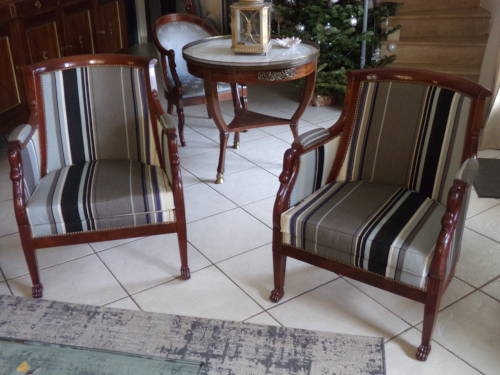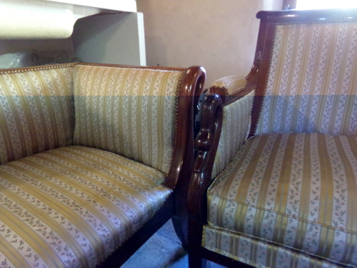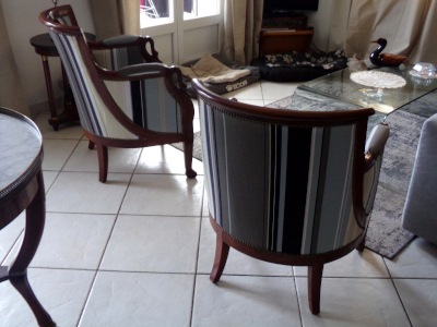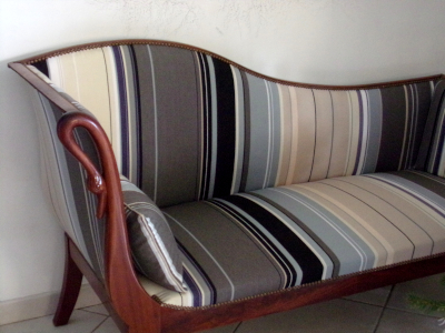 Salon Méridienne et deux Fauteuils Style Empire Meubles tissu "classique" Garniture de l’assise de la Méridienne et coussins des Fauteuils refait à neuf .Pose d’un tissu » Les Toiles du Soleil » fixé avec des clous décoratifs bronze doré