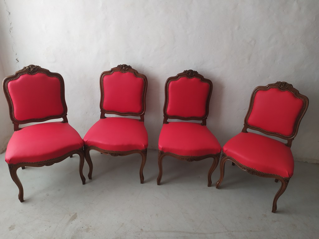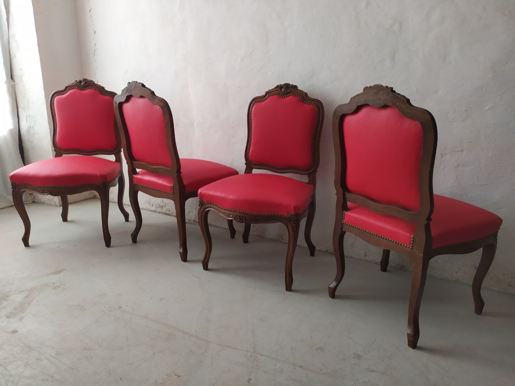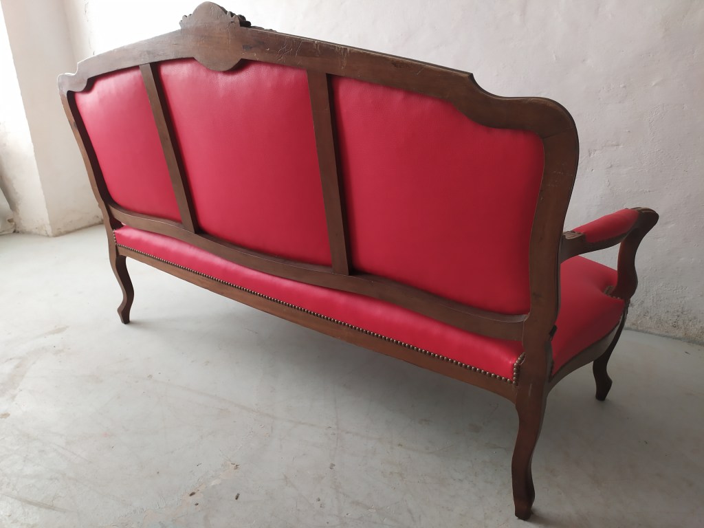 Salon complet Louis XV comprenant un canapé trois places et quatre chaises recouverts d’un similicuir rouge et finition avec des clous décoratifs bronze doré.